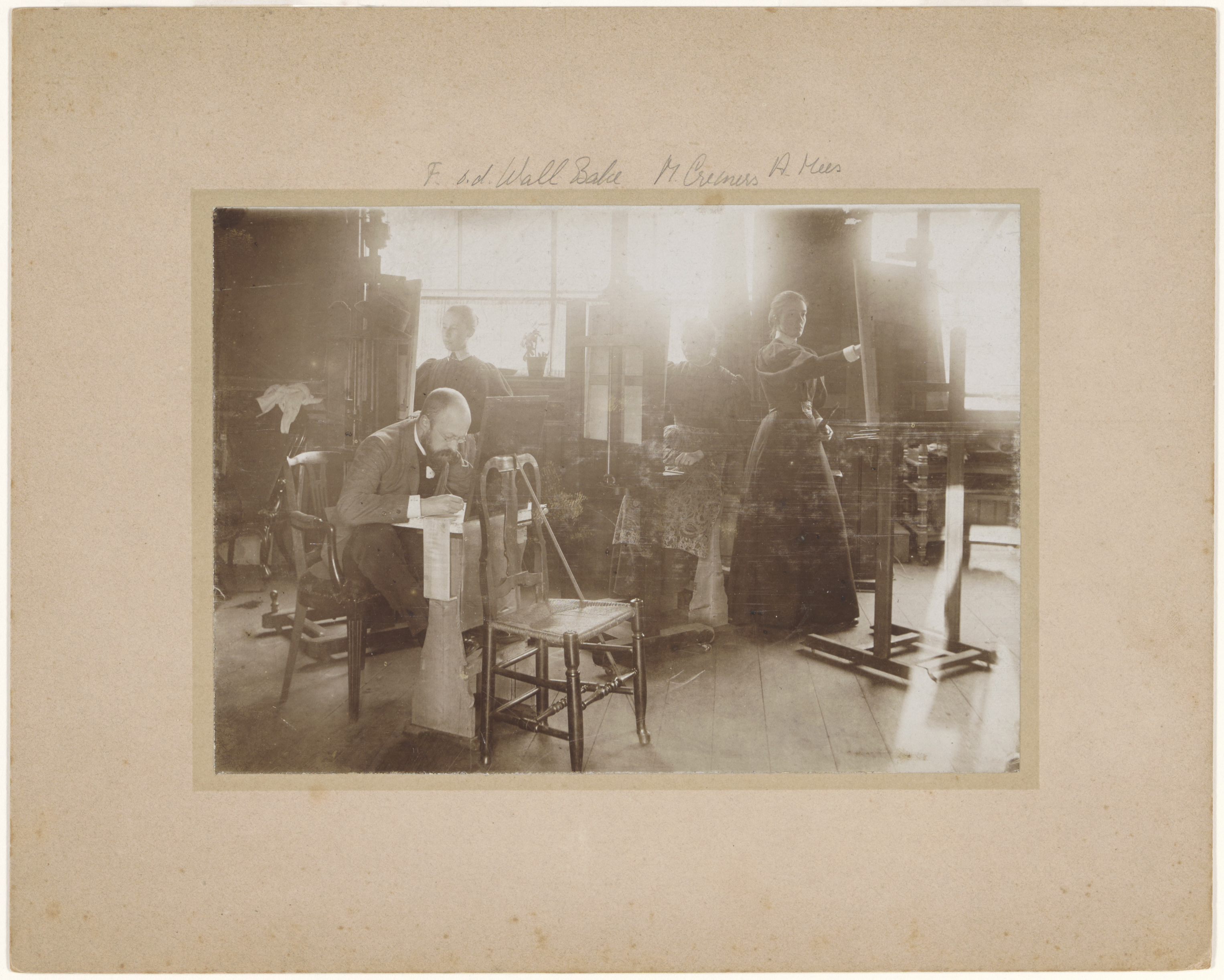 Foto van Jan Pieter Veth in zijn atelier met drie leerlingen F. van der Wall Bake, M. Cremers en A. Mees