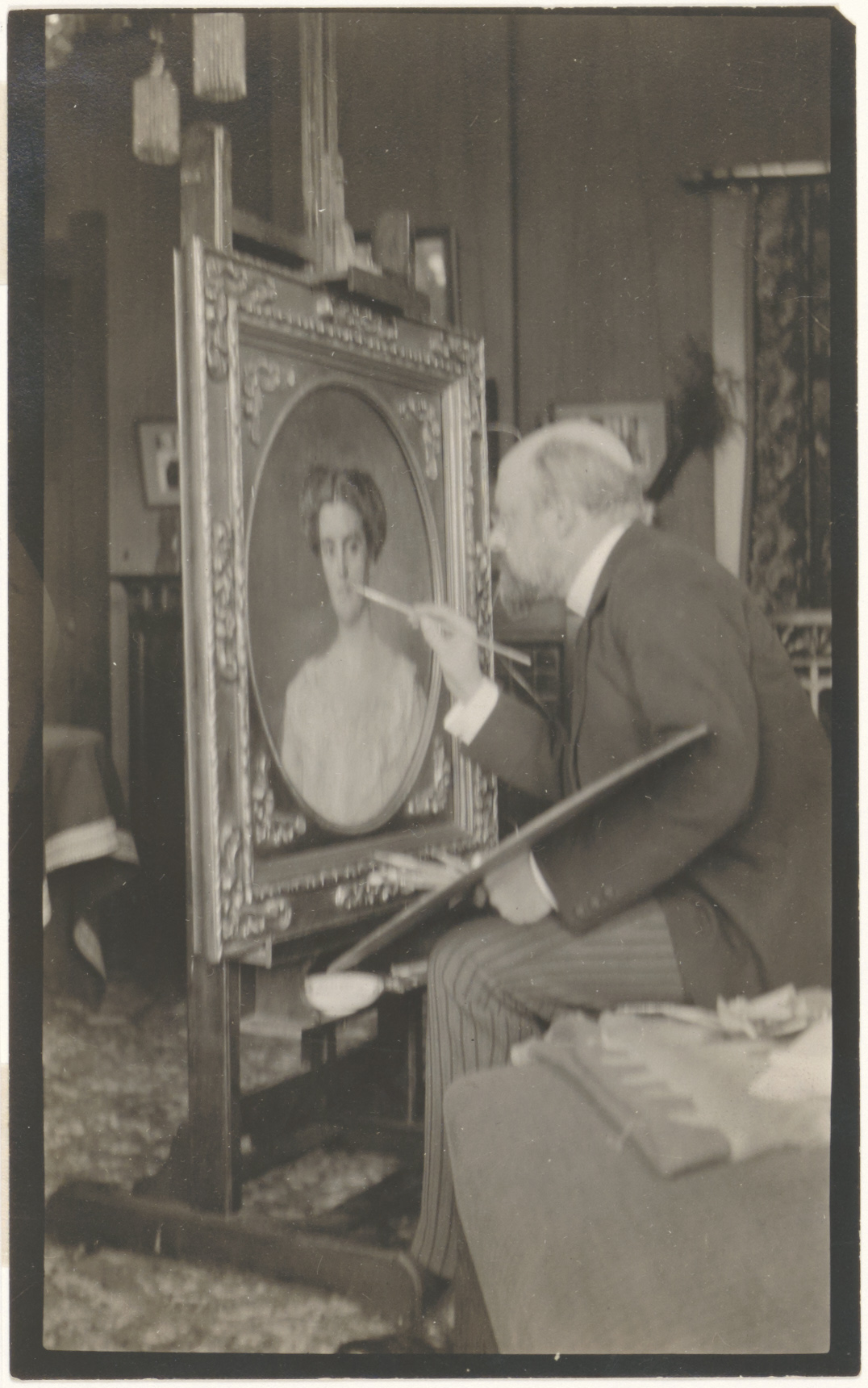 - Foto van Jan Pieter Veth in het atelier in Amerika tijdens het schilderen van een portret van mevrouw Pagenstecher