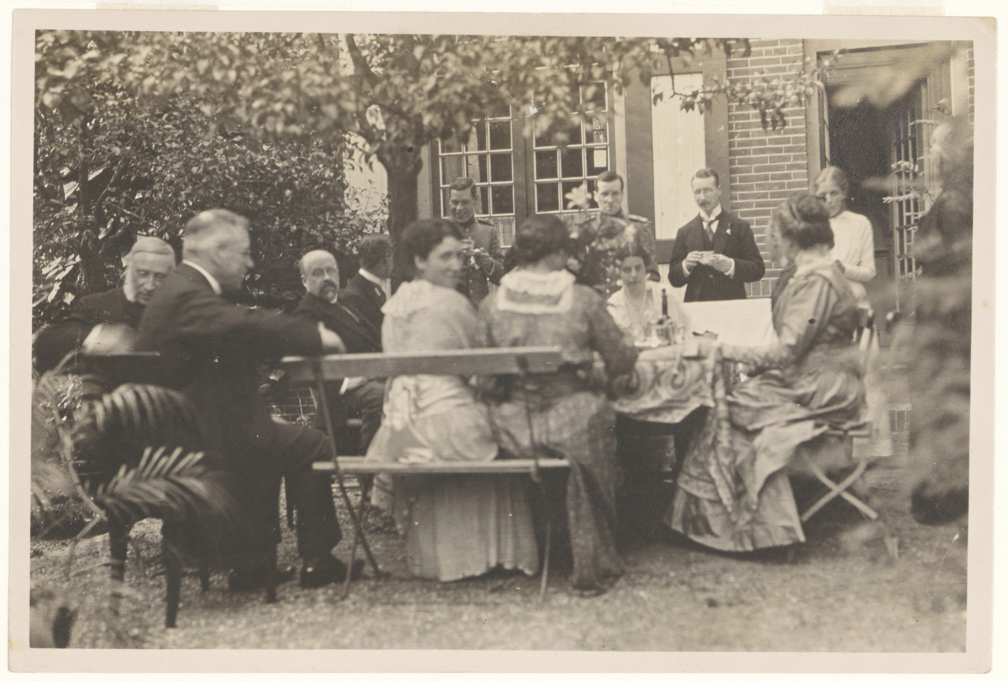 Foto van leden van de families Veth, Delprat, De Hoop Scheffer en Moes tijdens een maaltijd in de tuin