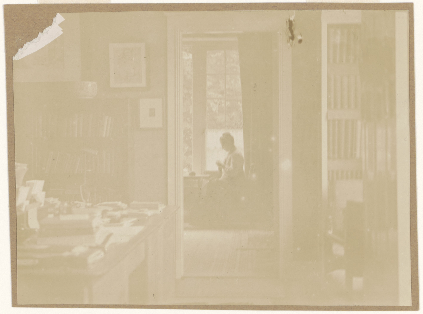 - Foto van het interieur van het huis te Bussum met bij de tuindeuren Anna Dorothea Veth-Dirks