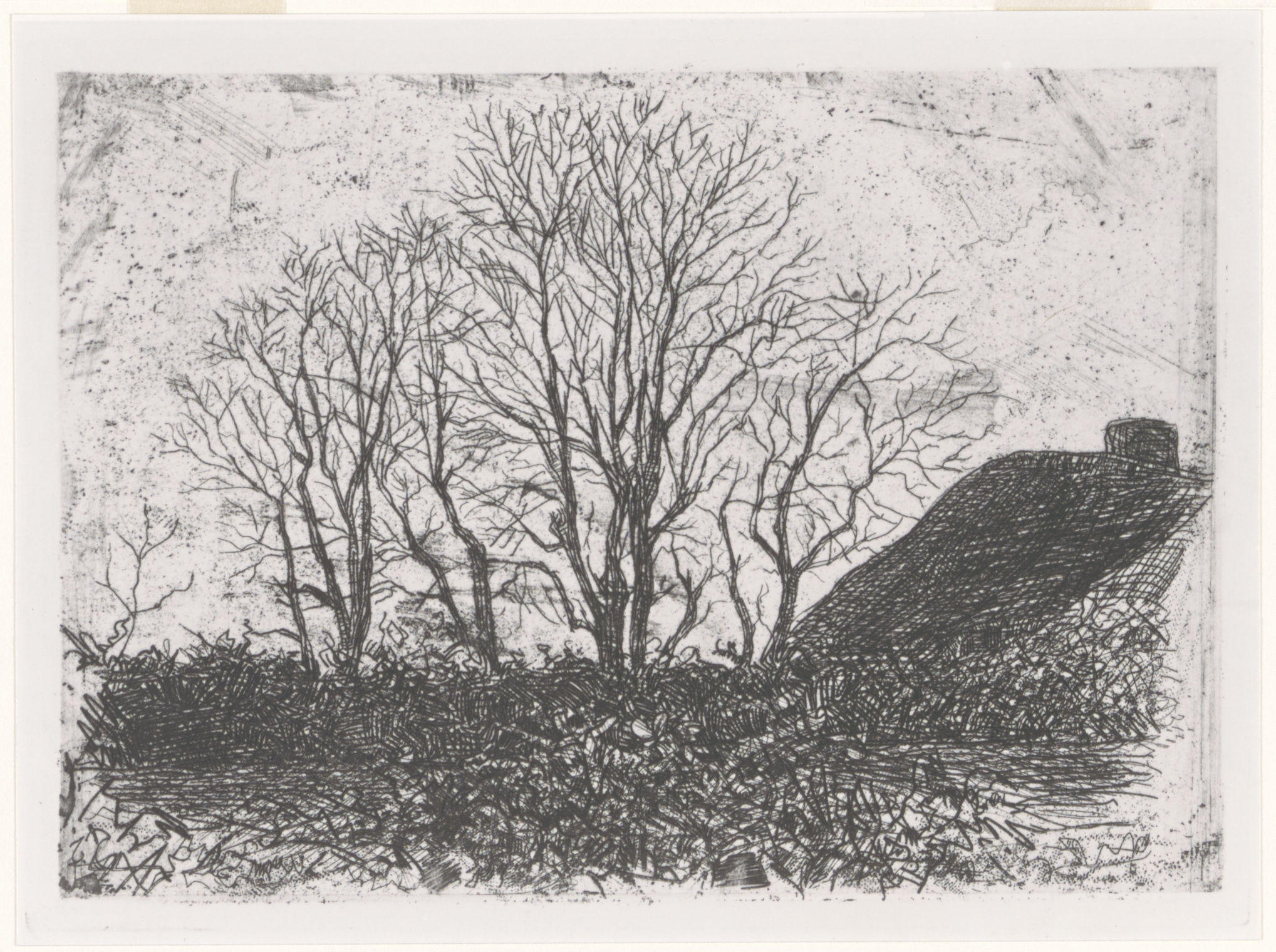 - Reproductie van een schets gemaakt door Jan P. Veth van een huis met bomen