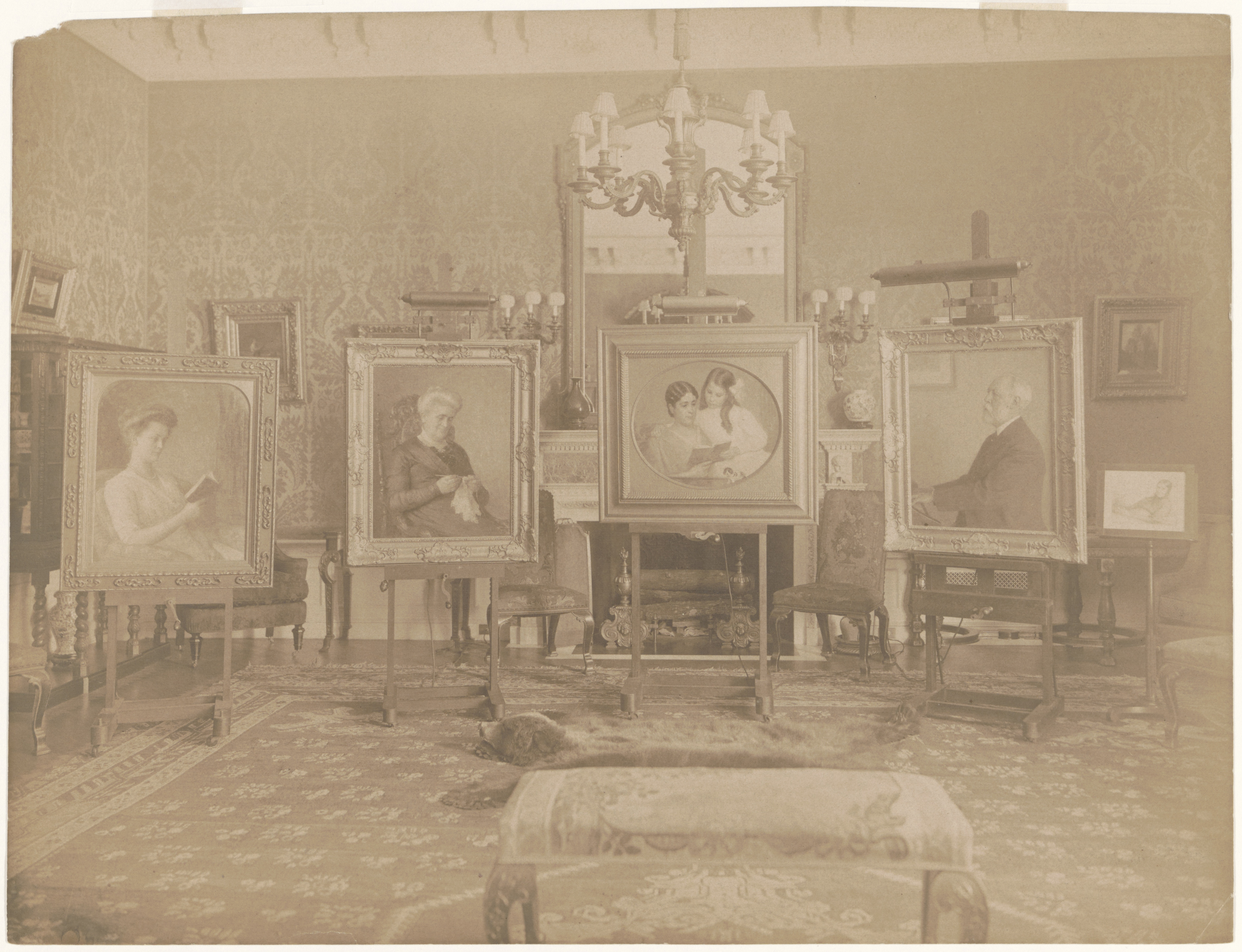 - Foto van een expositie van enkele door Jan P. Veth geschilderde portretten van de familie Warburg
