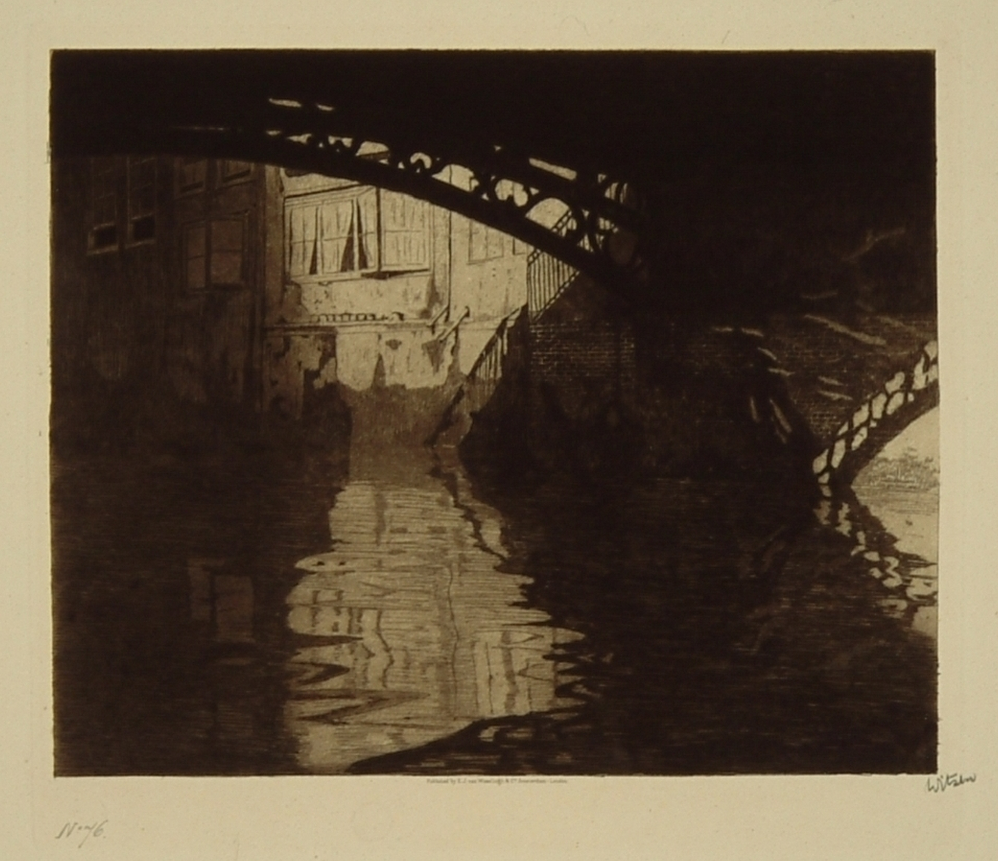 - Gezicht in de Voorstraatshaven onder de Visbrug door; nummer IV uit een serie van twaalf etsen door W. Witsen, uitgegeven door E.J. van Wisselingh & co. in 1900.