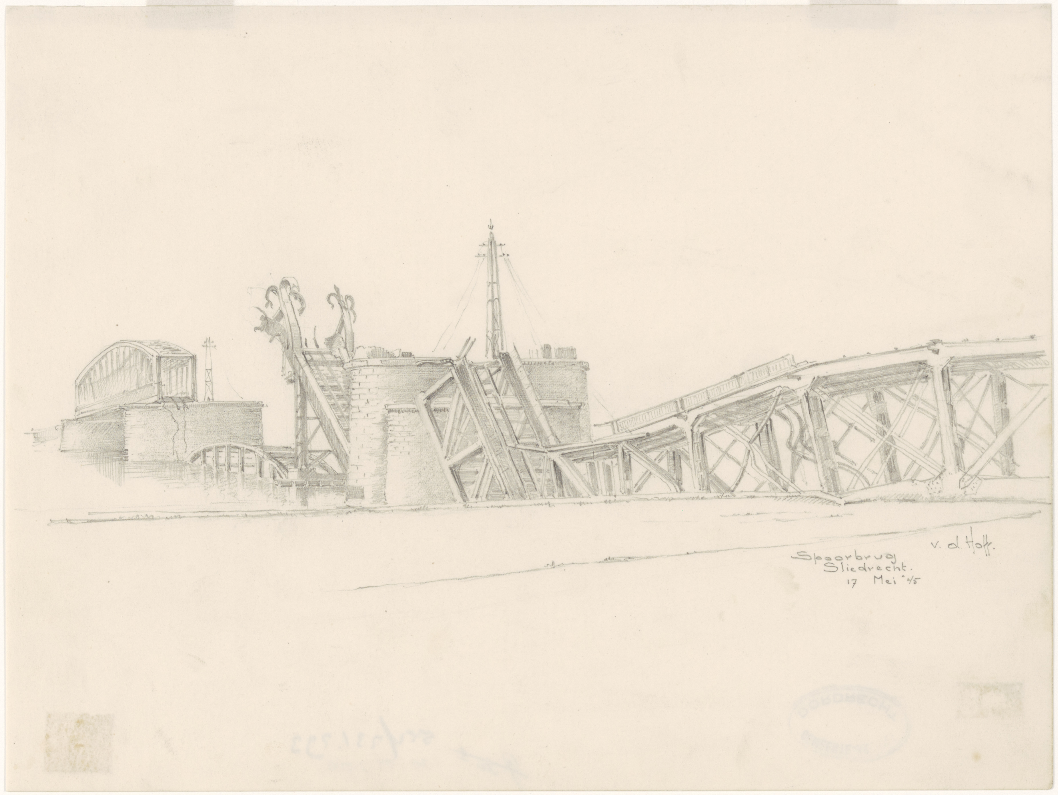 - Sliedrecht De door de Duitsers vernielde spoorwegbrug over de Merwede bij Baanhoek, gezien van de ringdijk van de Alblasserwaard, 18 mei 1945