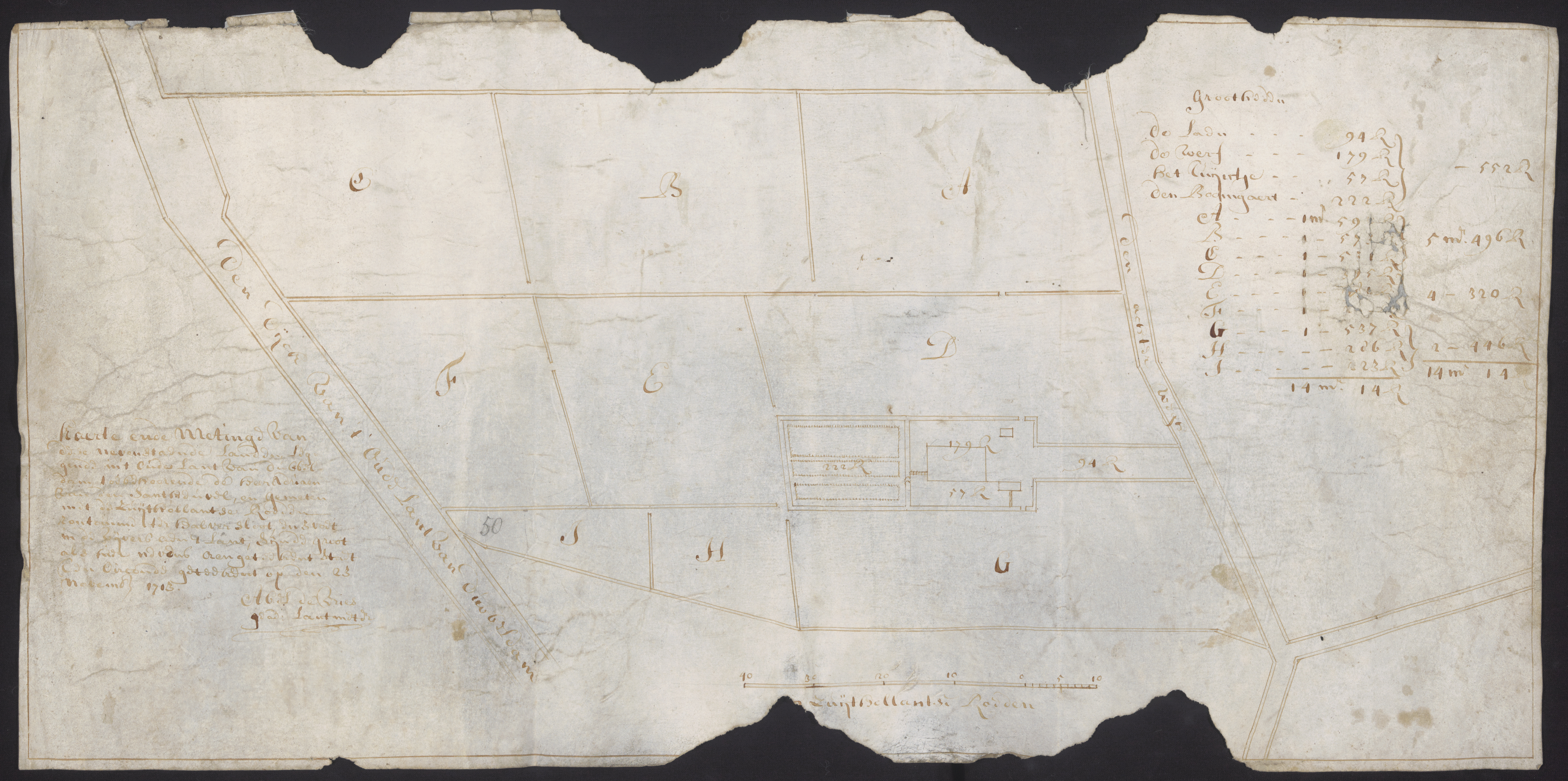 - Plattegrond uit 1713 door landmeter Mattheus de Vries van het gebied tussen de Achterweg en de Oudendijk.