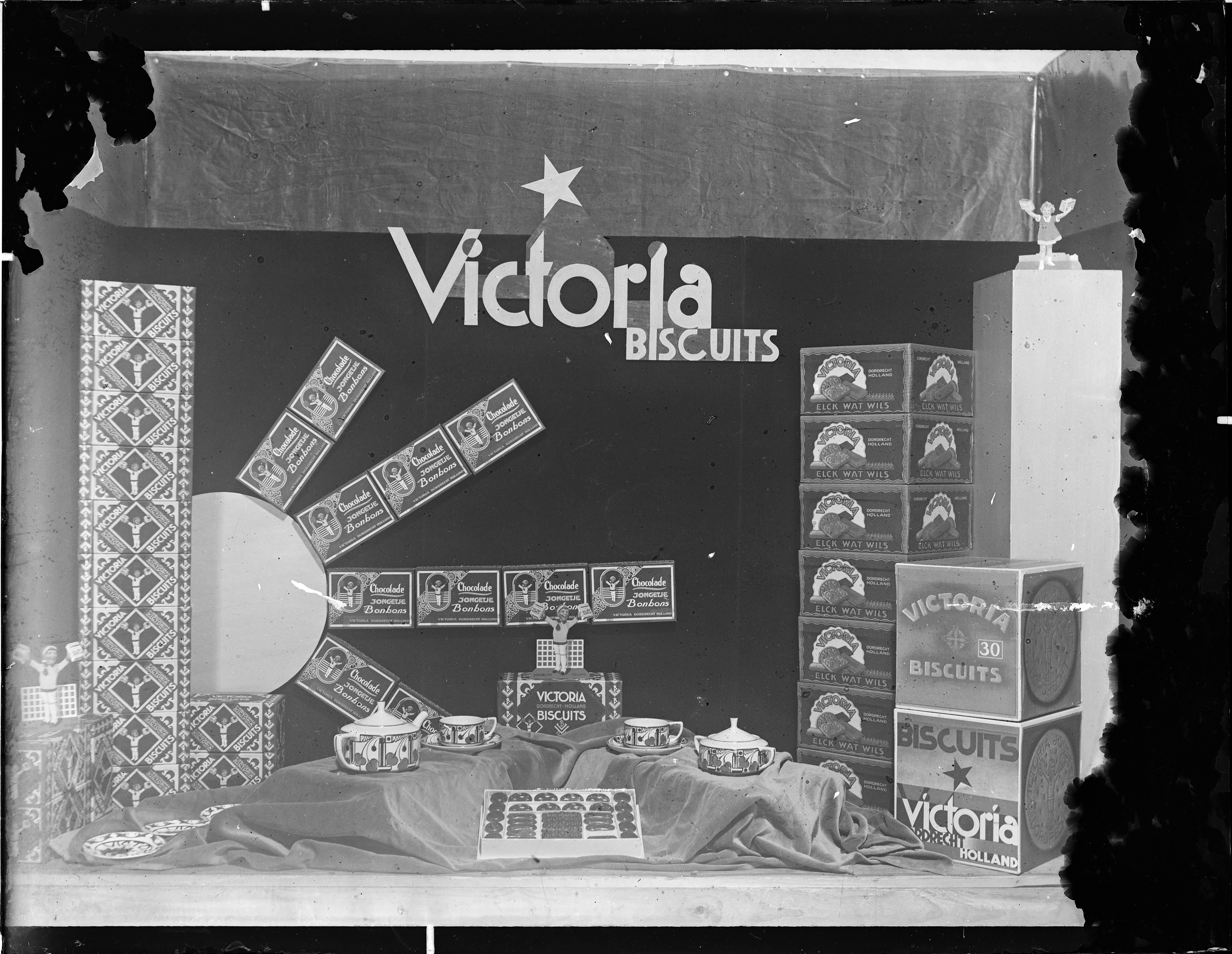 Uitstalling van producten van chocolade- en biscuitfabriek Victoria.