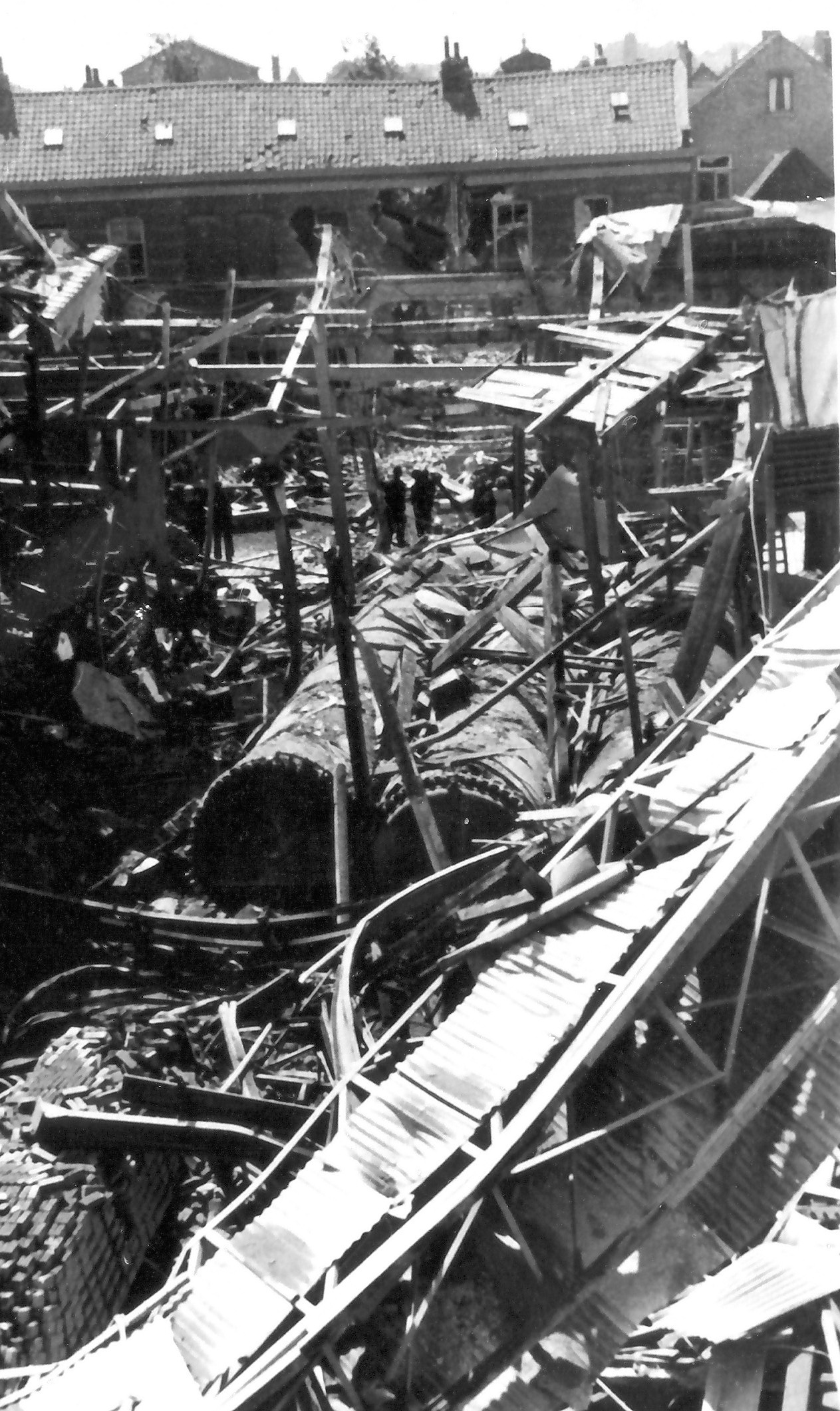 Ravage na een ontploffing bij kalkfabriek Van Dijk aan de Lijnbaan. Ook deze huizen in …