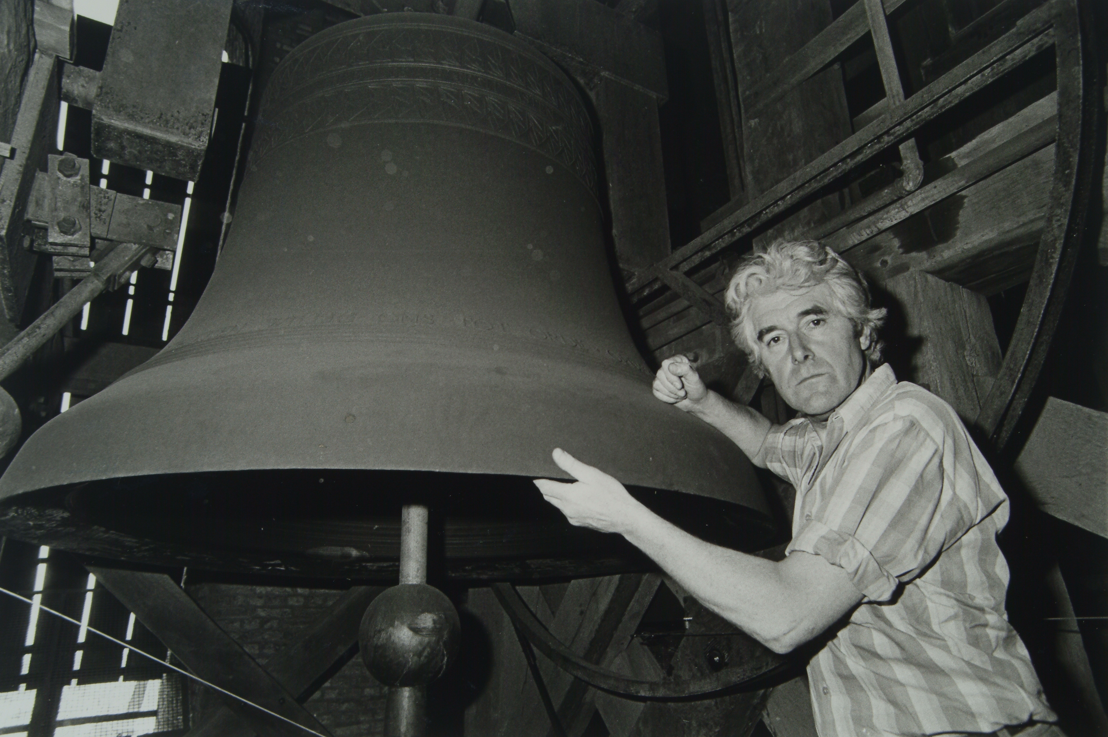Stadsbeiaardier Jaap van der Ende bij een van de klokken in de Grotekerkstoren