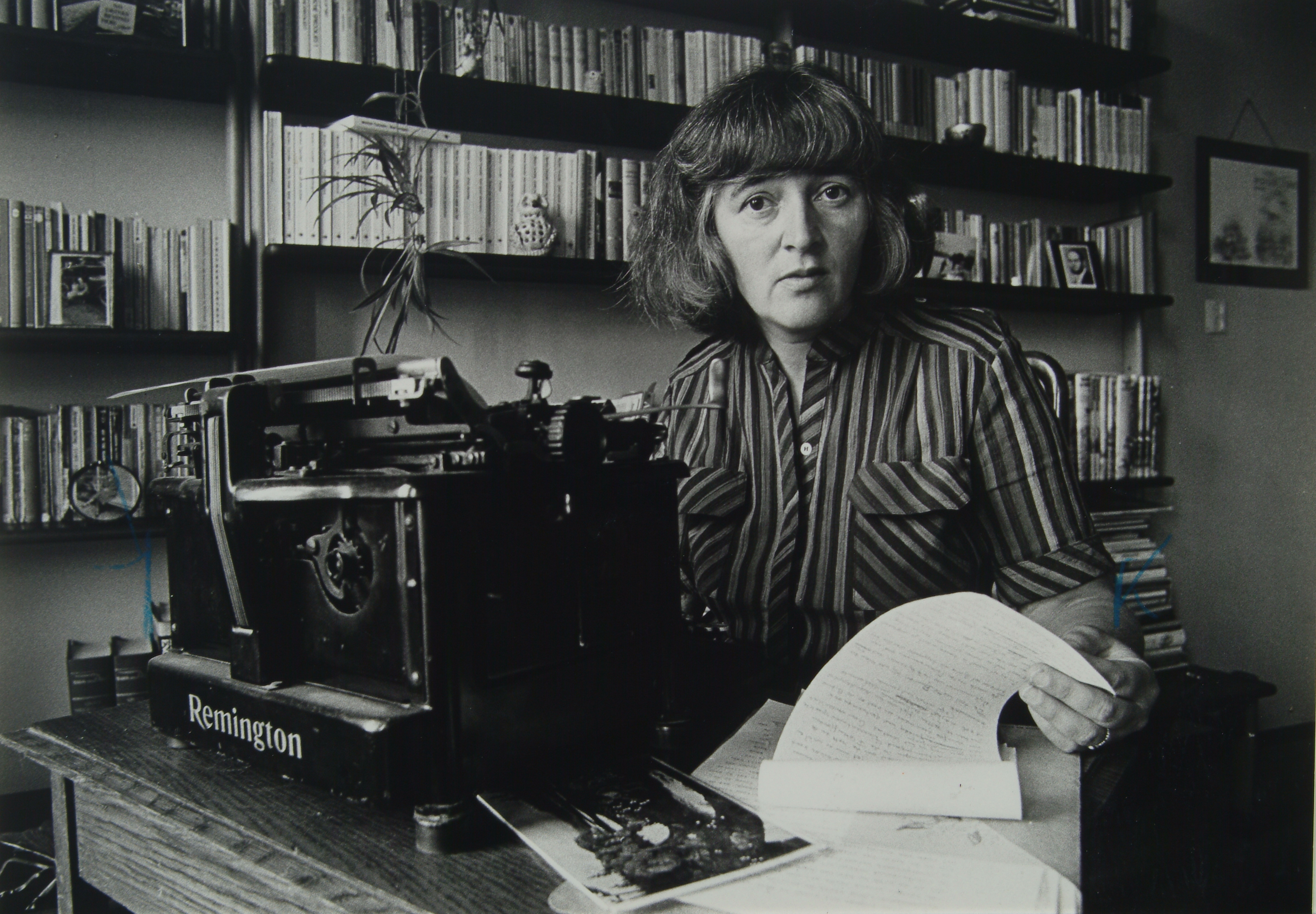 Schrijfster en celliste Wietske Nederveen achter haar Remington