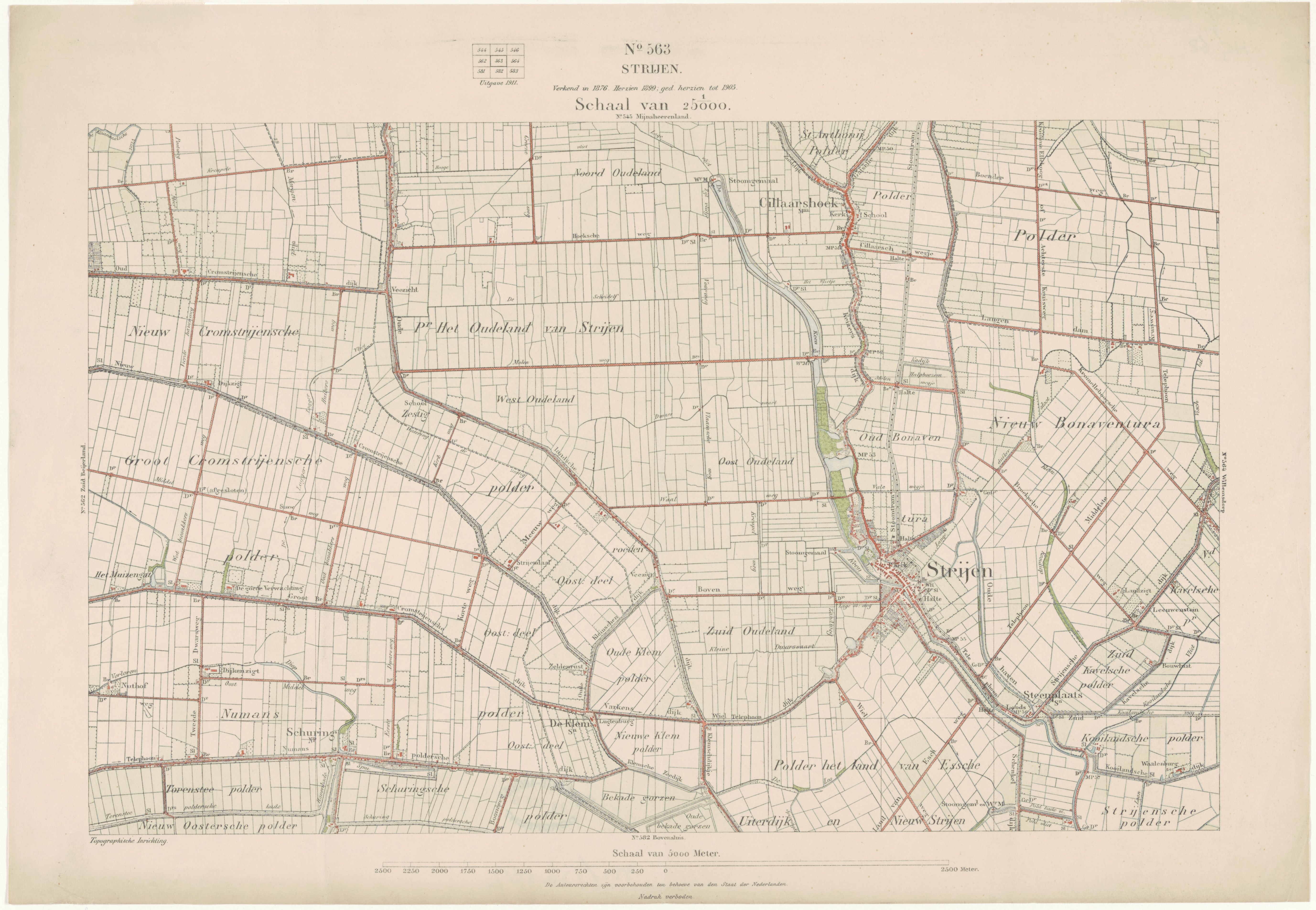 Topografische Kaart, blad 563 : Strijen. Afgebeeld zijn onder meer Het Oudeland van Strijen, Nieuw Bonaventura, en de Groot Cromstrijensche polder. Verkaveling, grondgebruik, poldernamen e.d. Noorden boven. Schaalstok: 5000 meter = 20 cm. Schaal 1:25.000.