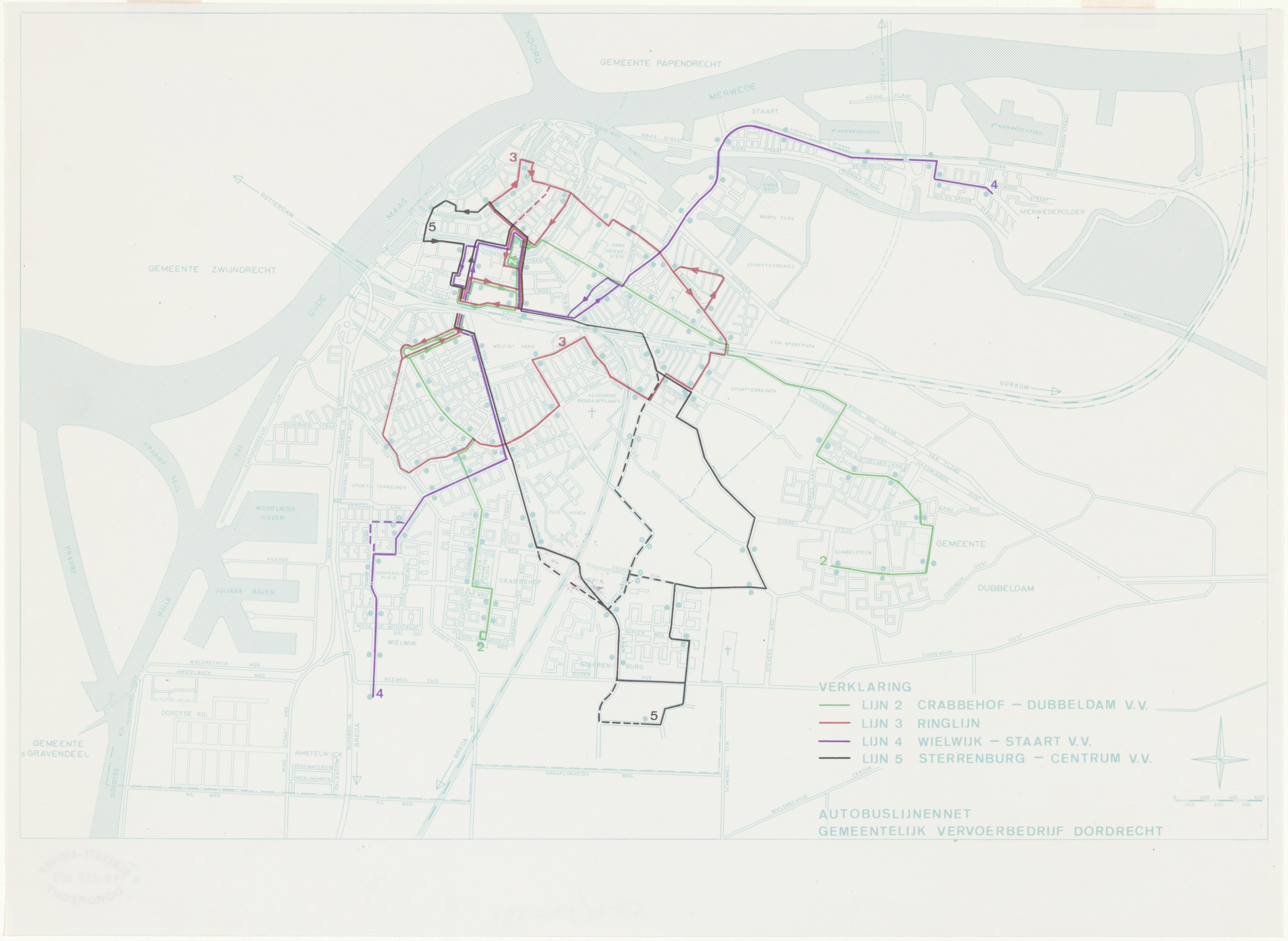 Plattegrond van Dordrecht met aanduiding van de (vier) buslijnen en de ligging van de …