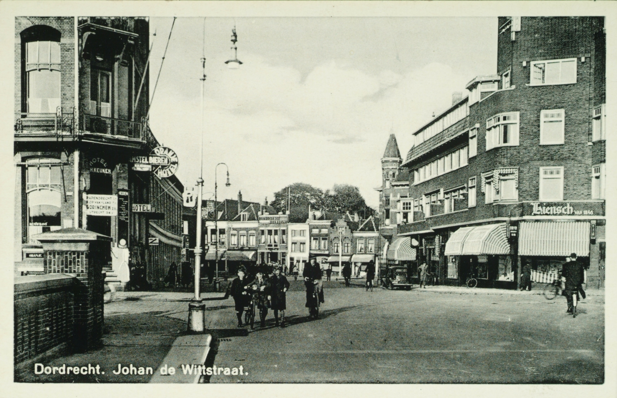 - Links het Oranjehotel. Geheel achtein, op het Bagijnhof, Het Dordrechtsch Nieuwsblad en rechts Hiensch van 1846.