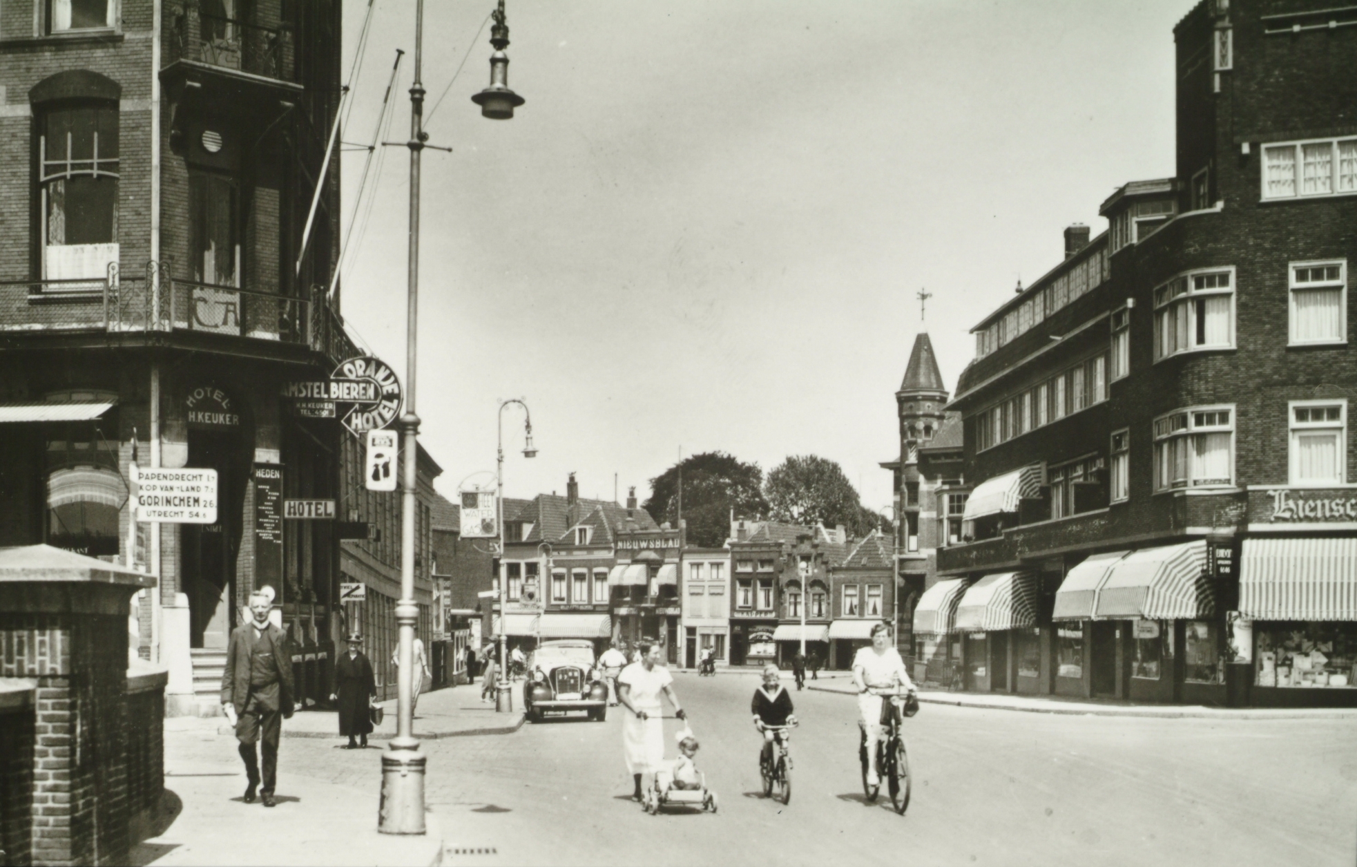 - Links het Oranjehotel. Achterin, op het Bagijnhog het Dordrechtsch Nieuwsblad en twee panden naar rechts een kapperszaak. Geheel rechts de textielzaak van Hiensch.