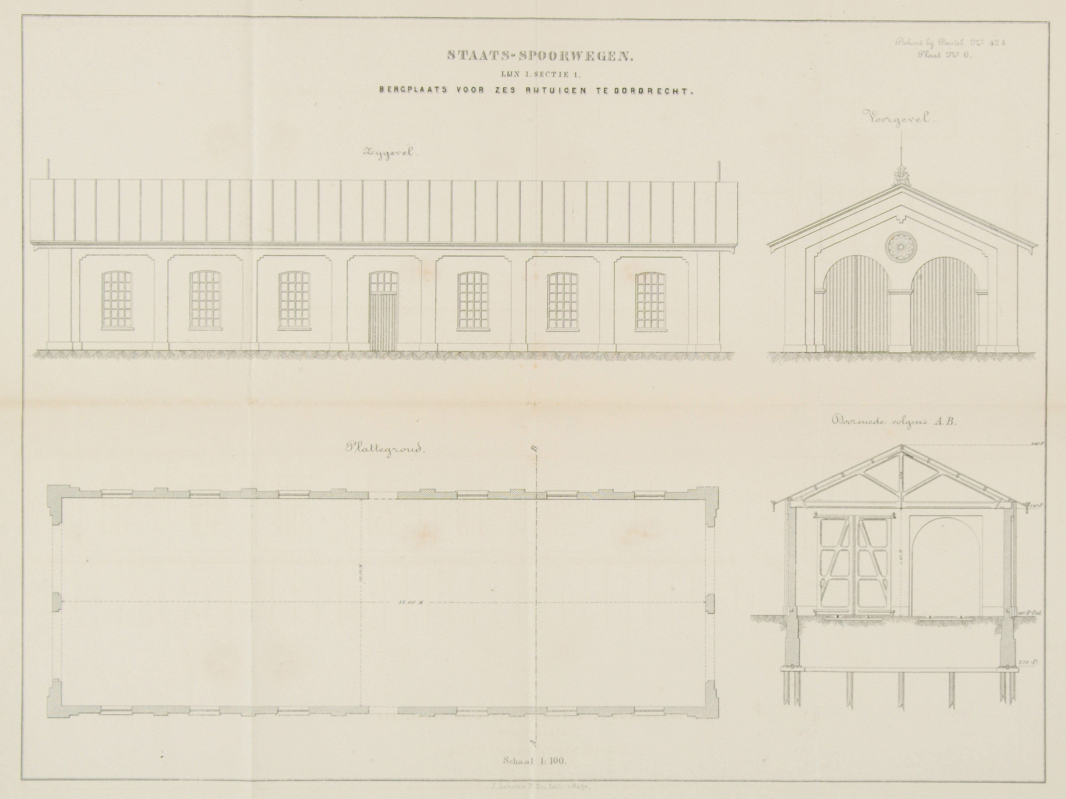 Zijaanzicht. vooraanzicht, plattegrond en doorsnede van een bergplaats voor 6 rijtuigen van de Staats-spoorwegen te Dordrecht.