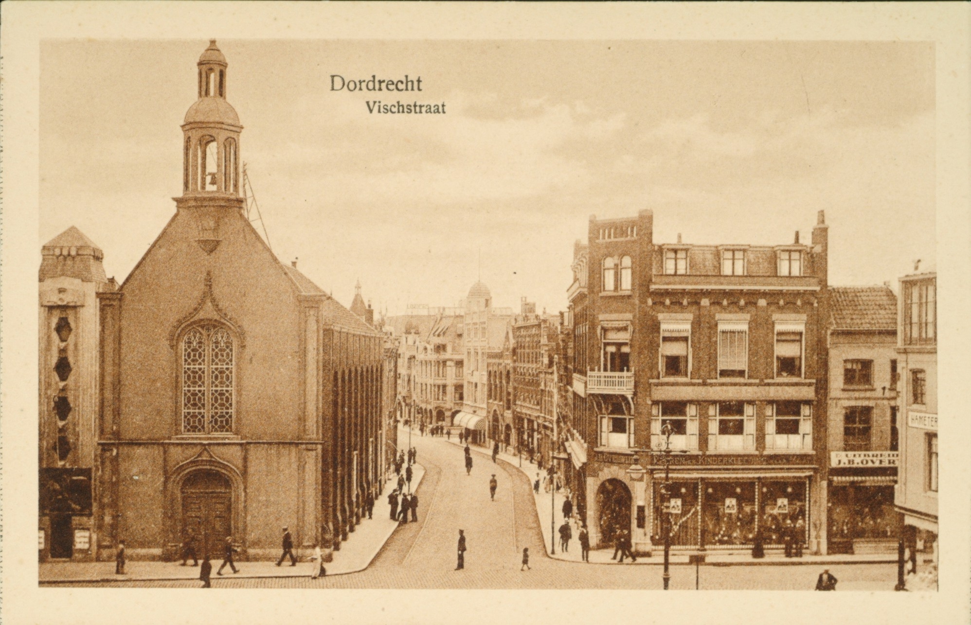 - Visstraat met de Waalse kerk op de hoek van de Voorstraat. Ca. 1930. Rechts de kledingwinkel van J.B. Overwijn.