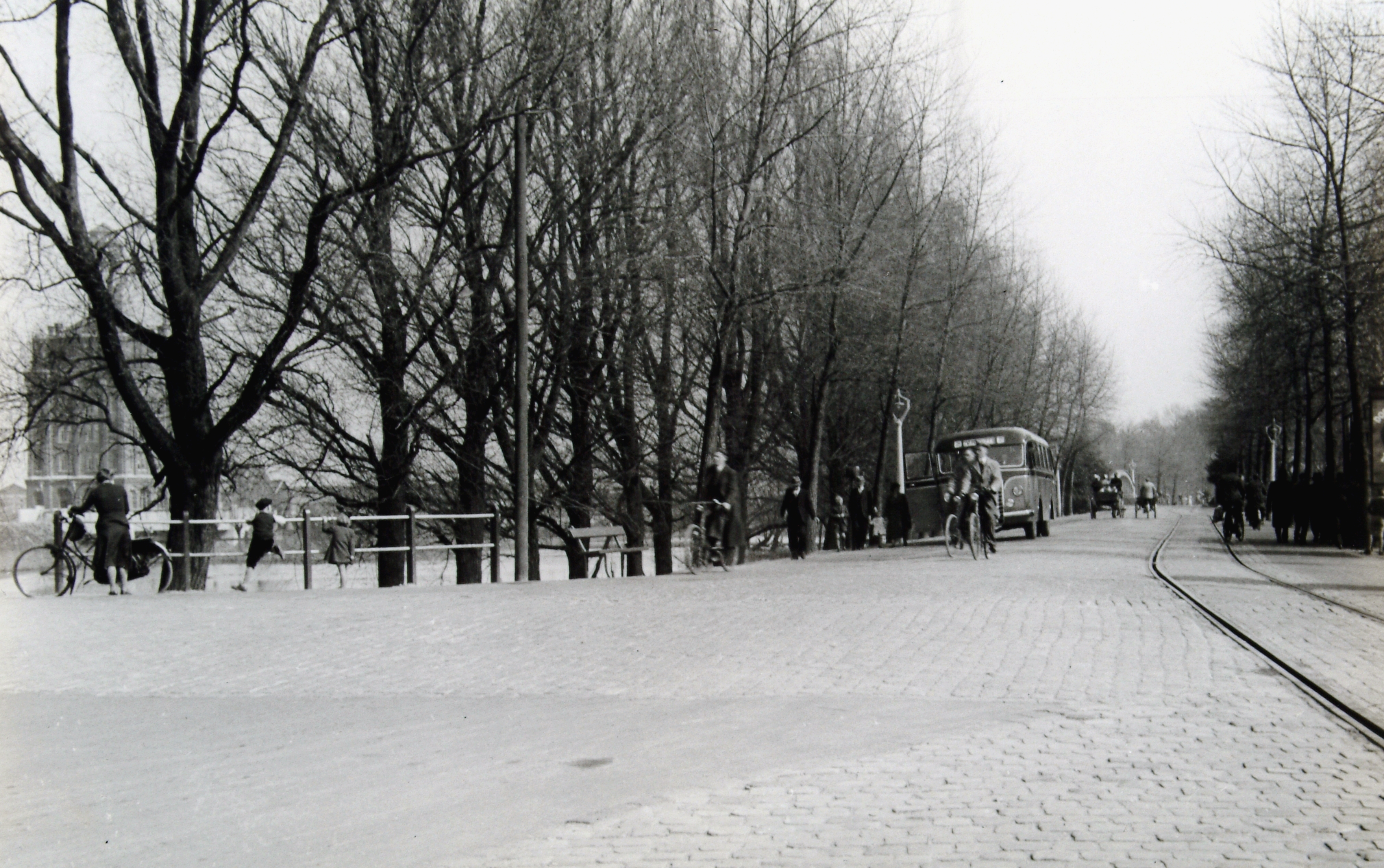 - De Oranjelaan met spoorrails voor de goederentrein, gezien vanaf de Noordendijk (links) naar de Staart. Links de watertoren.