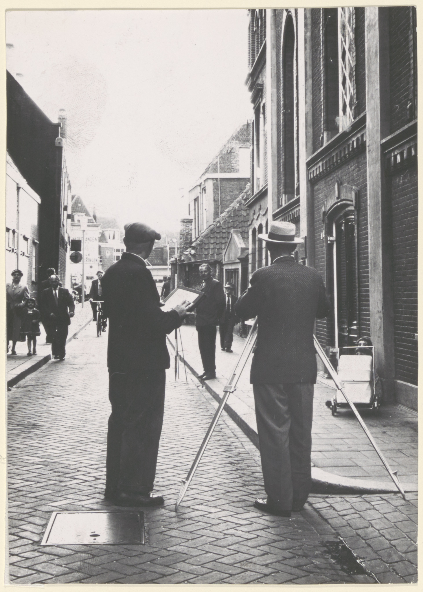 - De Lenghenstraat, naar de Johan de Wittstraat gezien. Een meetploeg van de dienst Openbare Werken is de straat aan het opmeten voor de sanering.