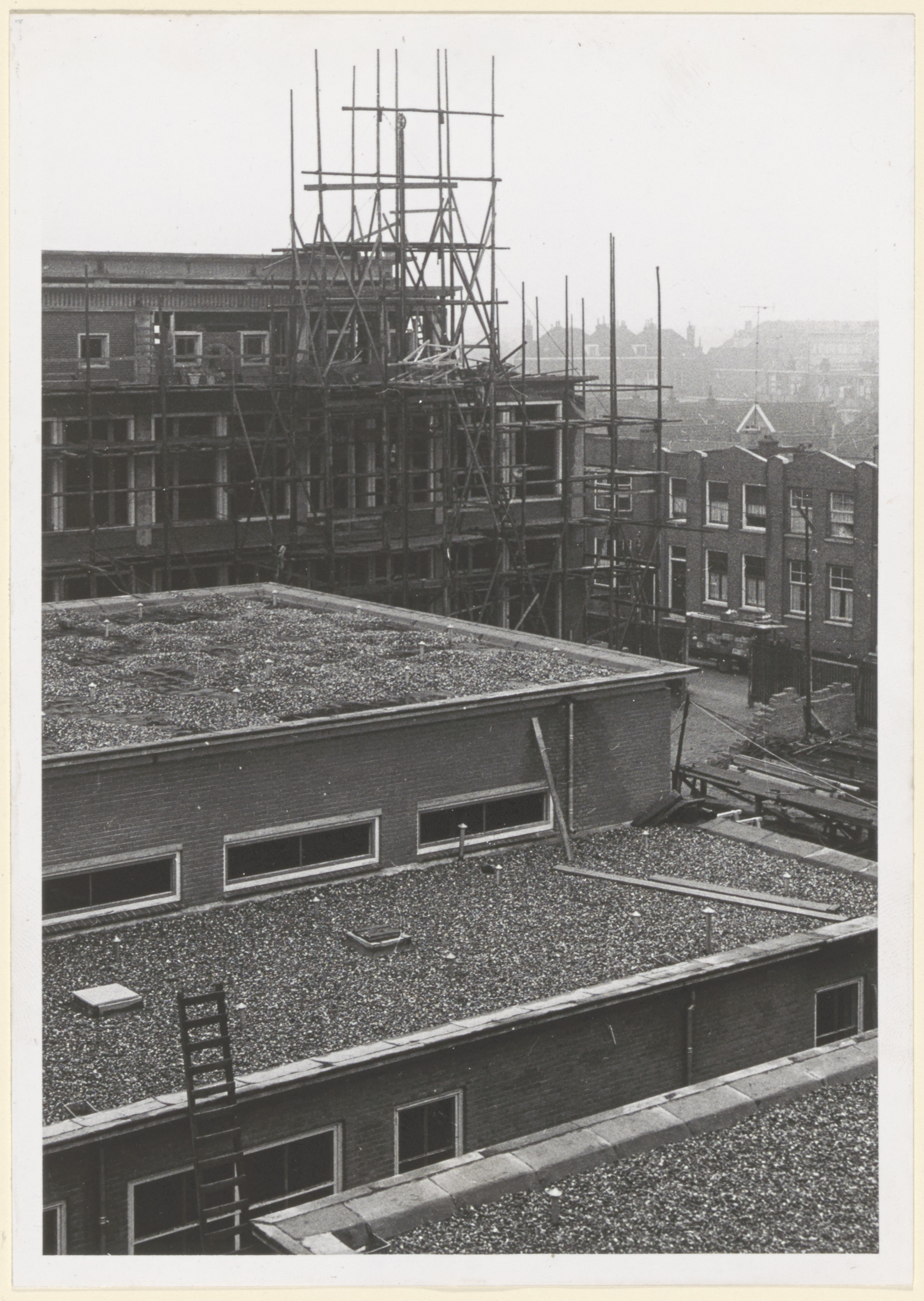 Verbouwing (uitbreiding) van de Technische School aan Reeweg Oost. De huizen rechts …