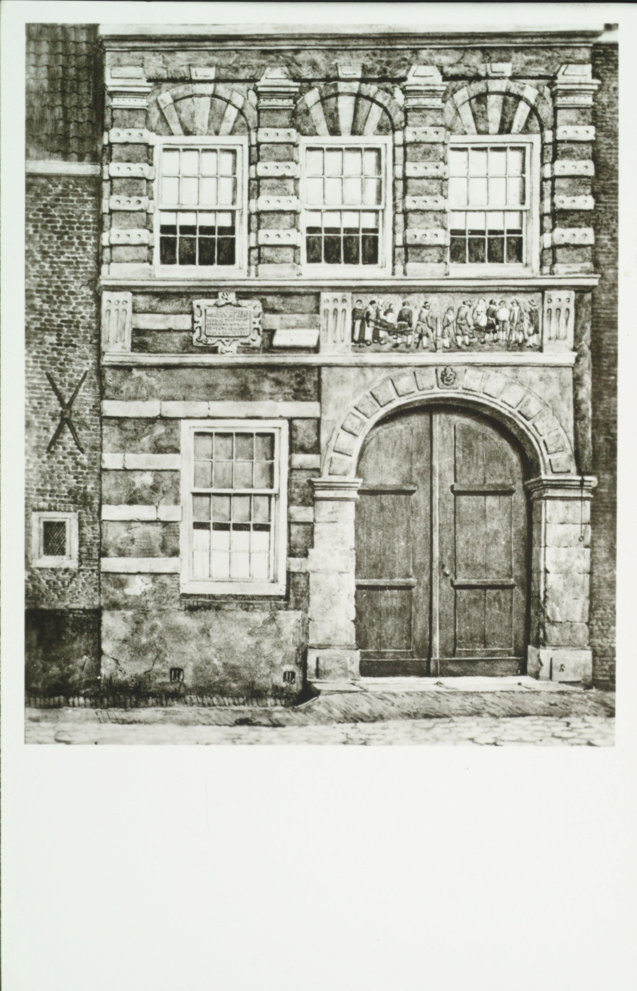 De voorgevel van het Gast- of Ziekenhuis aan de Visstraat, hoek Breestraat. Een tekening van J. Rutten uit 1877.