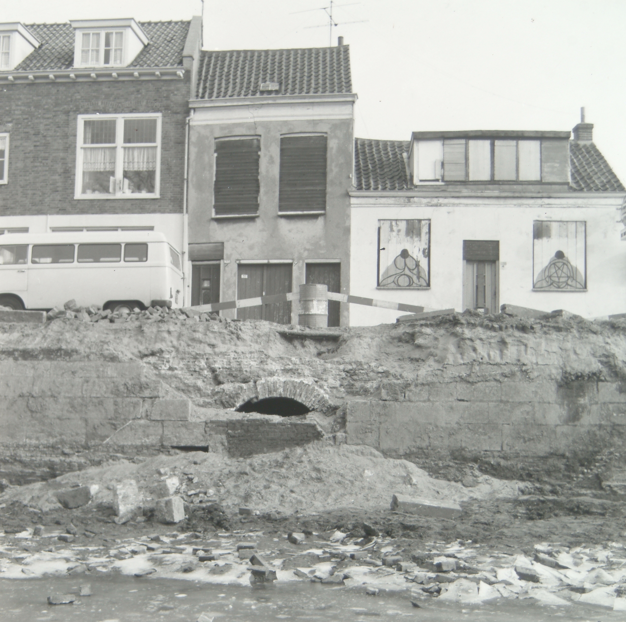 Resten van de stadsmuur in de drooggelegde Spuihaven tussen Spuibrug en het Achterom