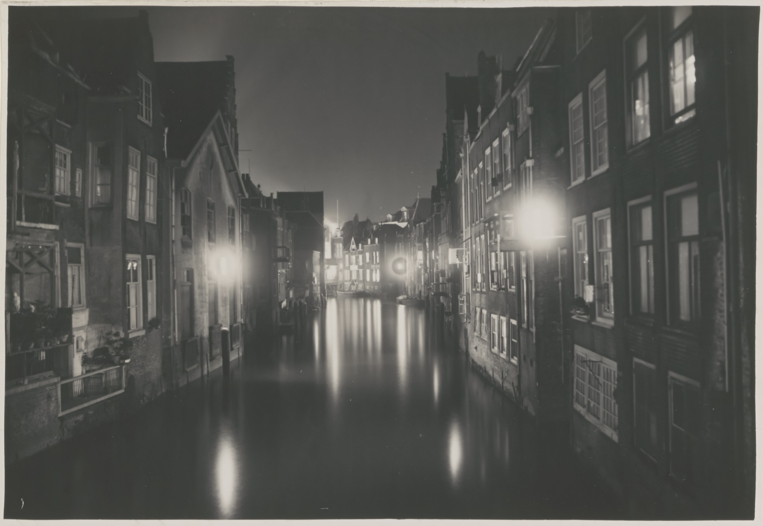 - De Voorstraatshaven met verlichting ter gelegenheid van de ingebruikneming van de Zeehaven, gezien vanaf de Pelserbrug richting Lombardbrug. Links de Grotekerksbuurt, rechts de Voorstraat.