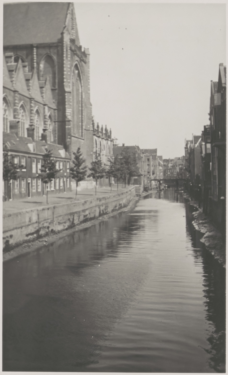- De Voorstraatshaven tussen de Pottenkade (links) en de Voorstraat, gezien vanaf de Leuvebrug richting Pelserbrug.