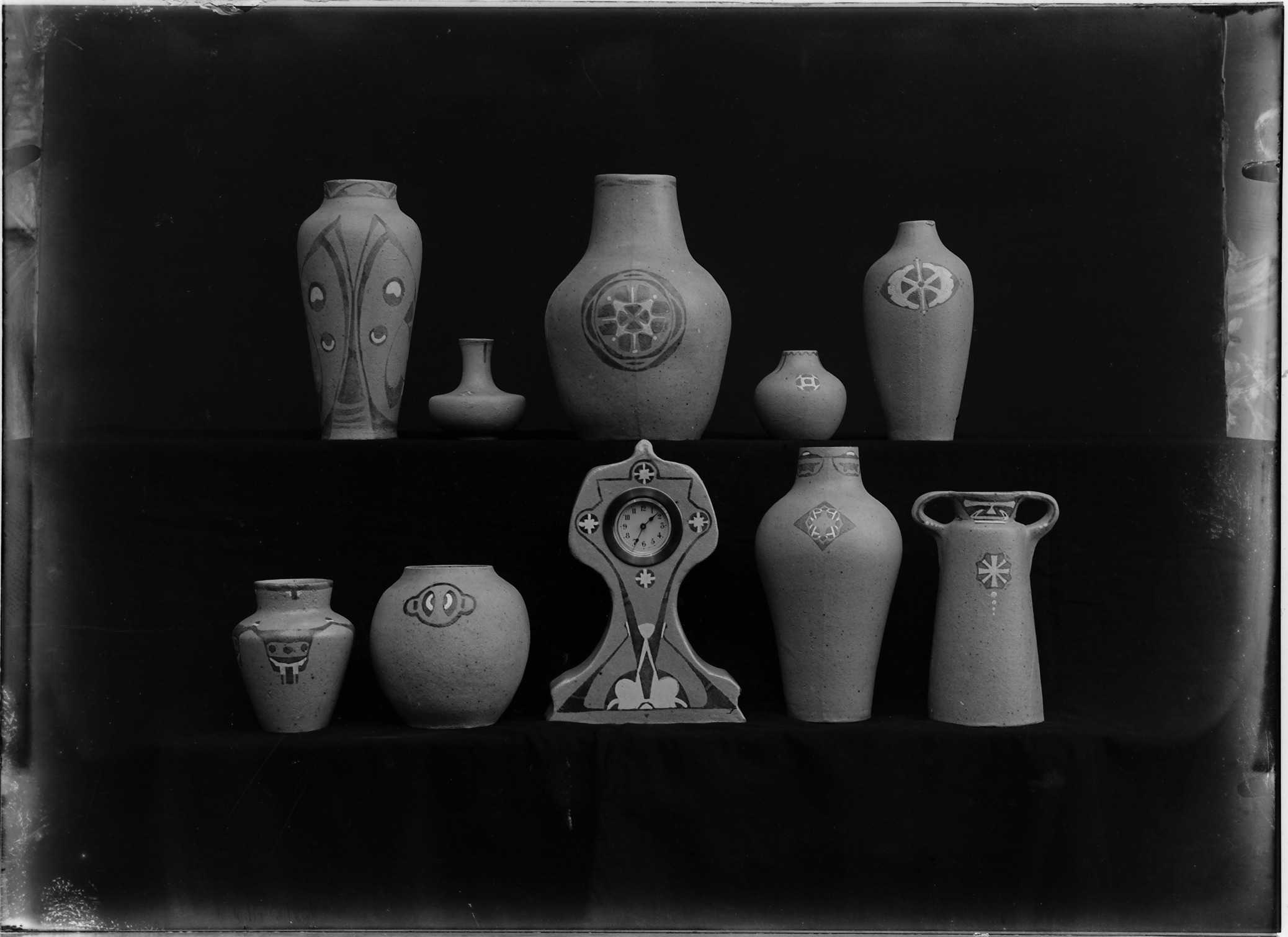 - Opstelling van potten, vazen en klokken van de Dordtsche Kunstpotterij aan de Blekersdijk