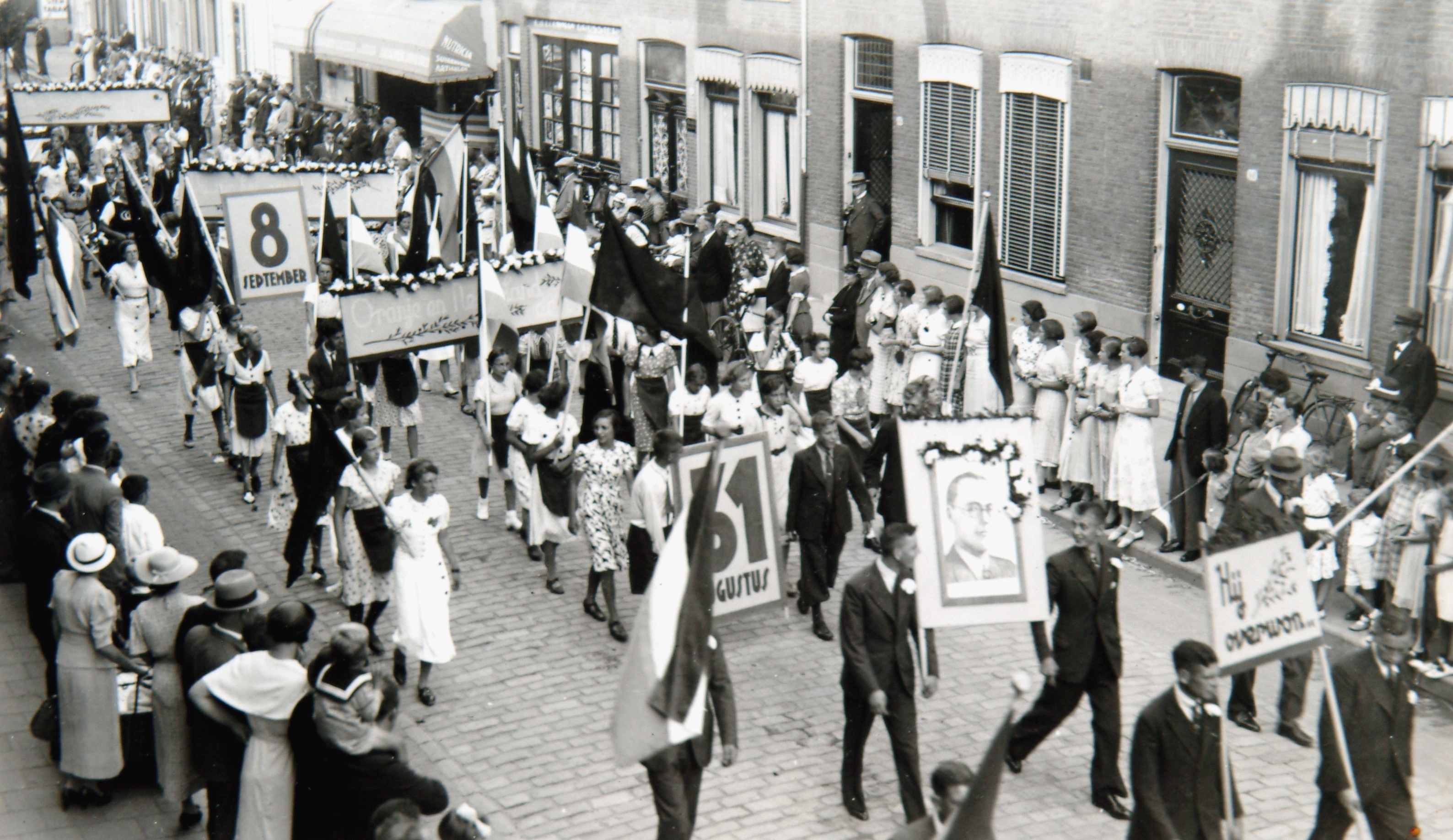 - Optocht in de in de optocht op de Spuiweg tijdens de Oranjedag. Dit deel van de optocht voert de verlovingsdatum van prinses Juliana en prins Bernhard met zich mee.