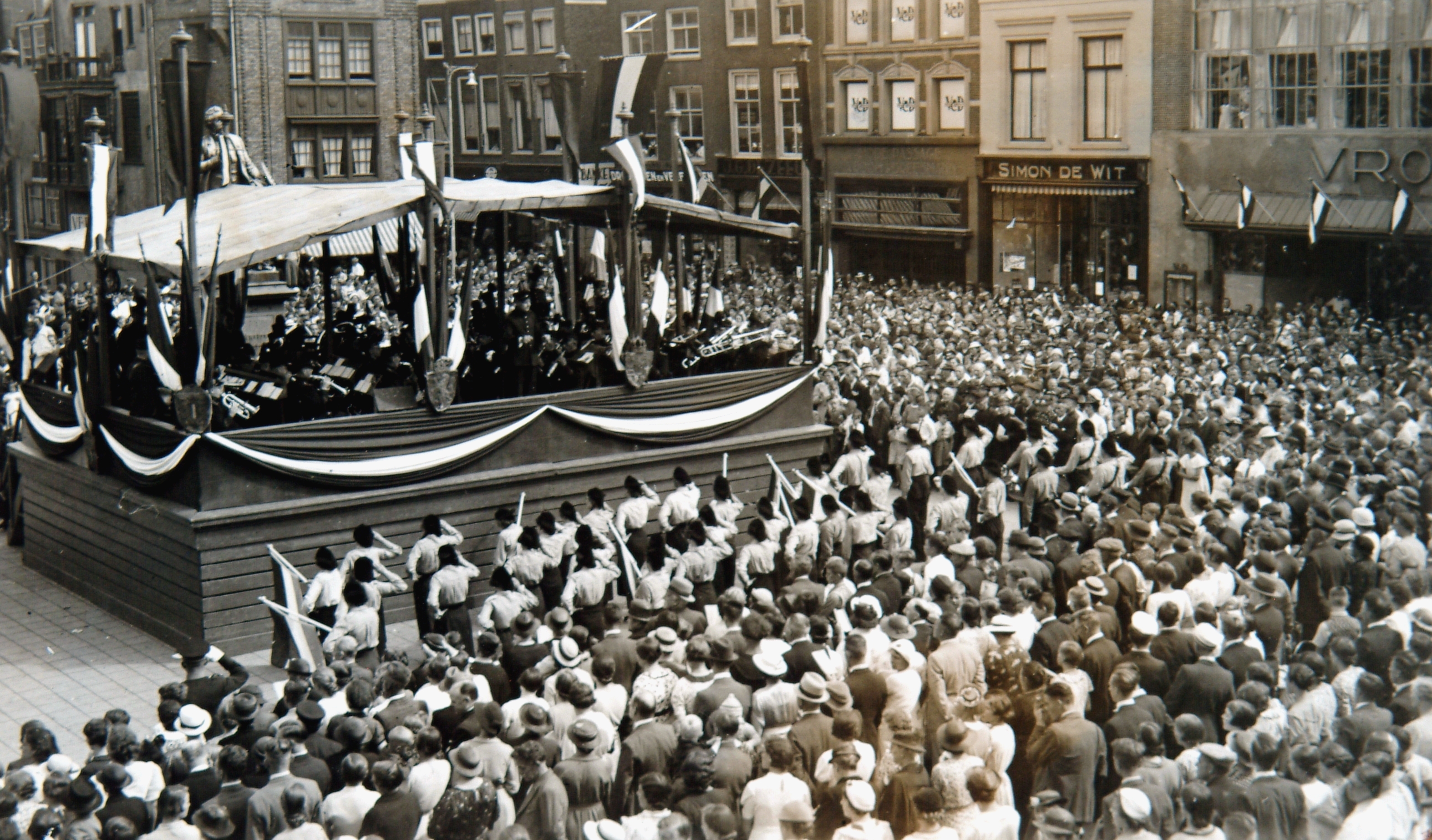 - De aubade op het Scheffersplein tijdens Oranjedag.