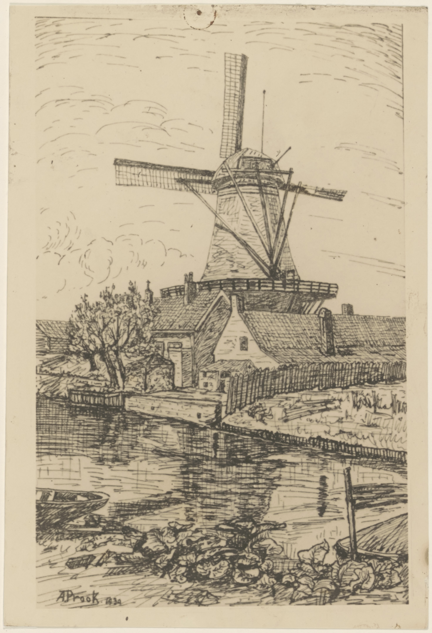Tekening van korenmolen (vroeger pelmolen) De Pelikaan aan de zuidzijde van de …