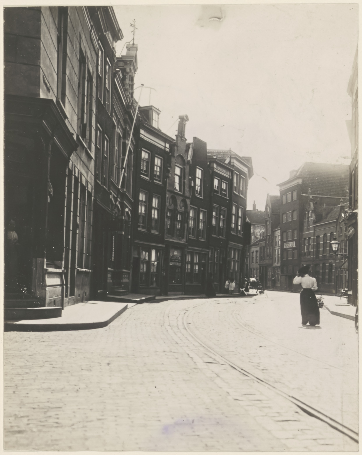 - De Wijnstraat met rails voor de paardentram, nabij het Groothoofd, gezien naar het zuiden. Pakhuis Bordeau aan de rechterkant van de straat.