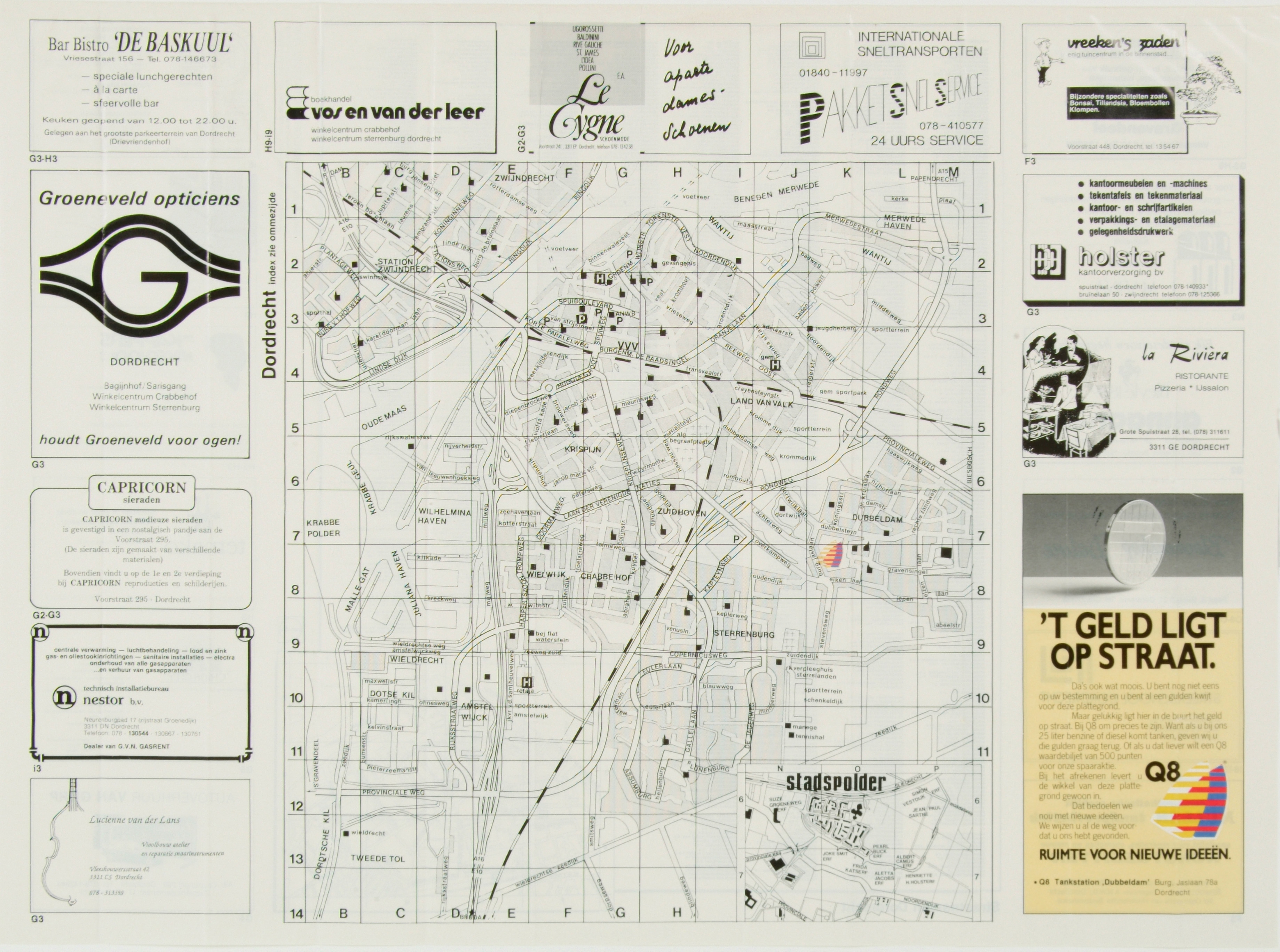 - Plattegrond van Dordrecht met reclame en stratenregister.