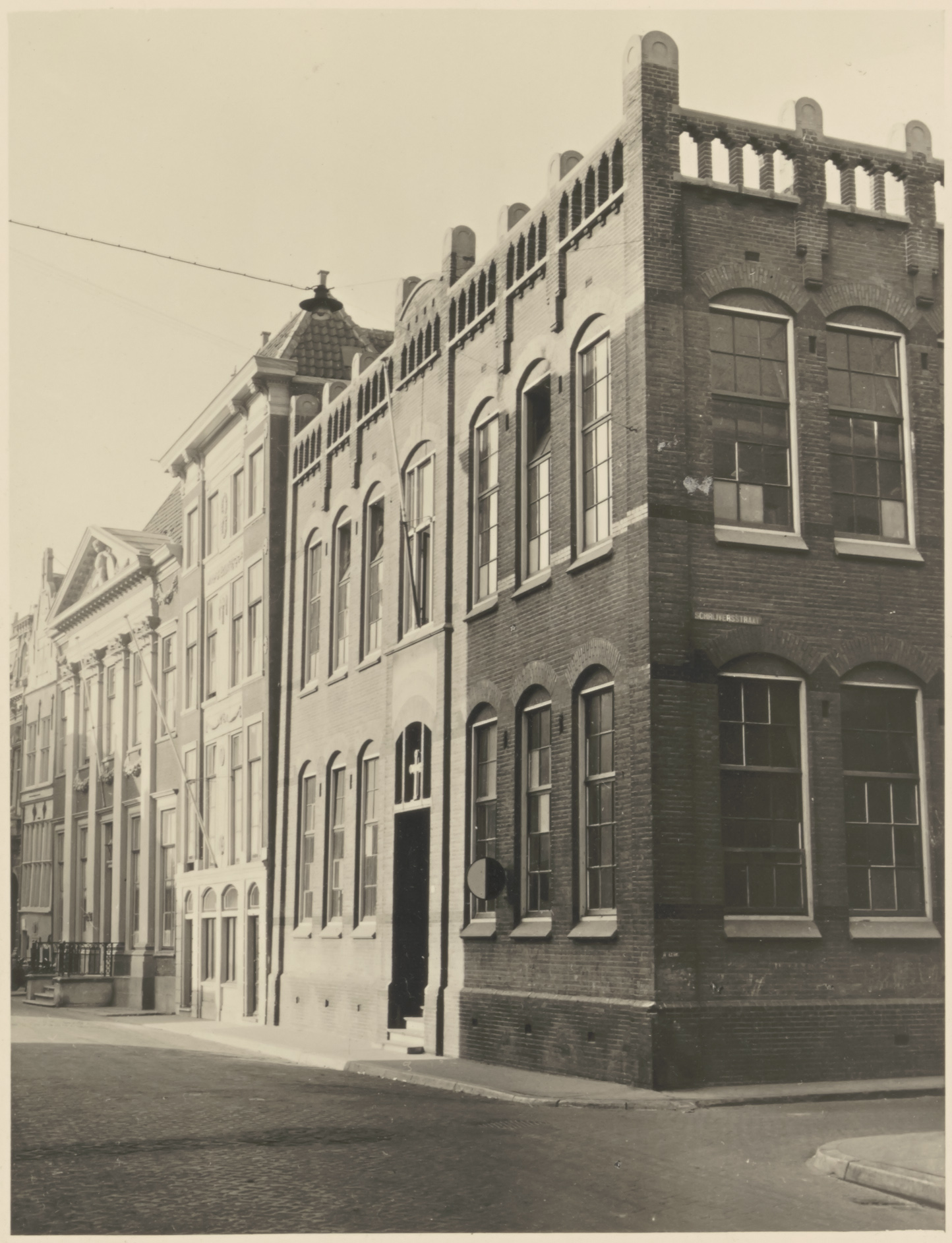 - Huizen aan de westzijde van de Wijnstraat, vanaf de hoek van de Schrijversstraat richting de Gravenstraat. Links huis De Onbeschaamde, rechts de RK-school.