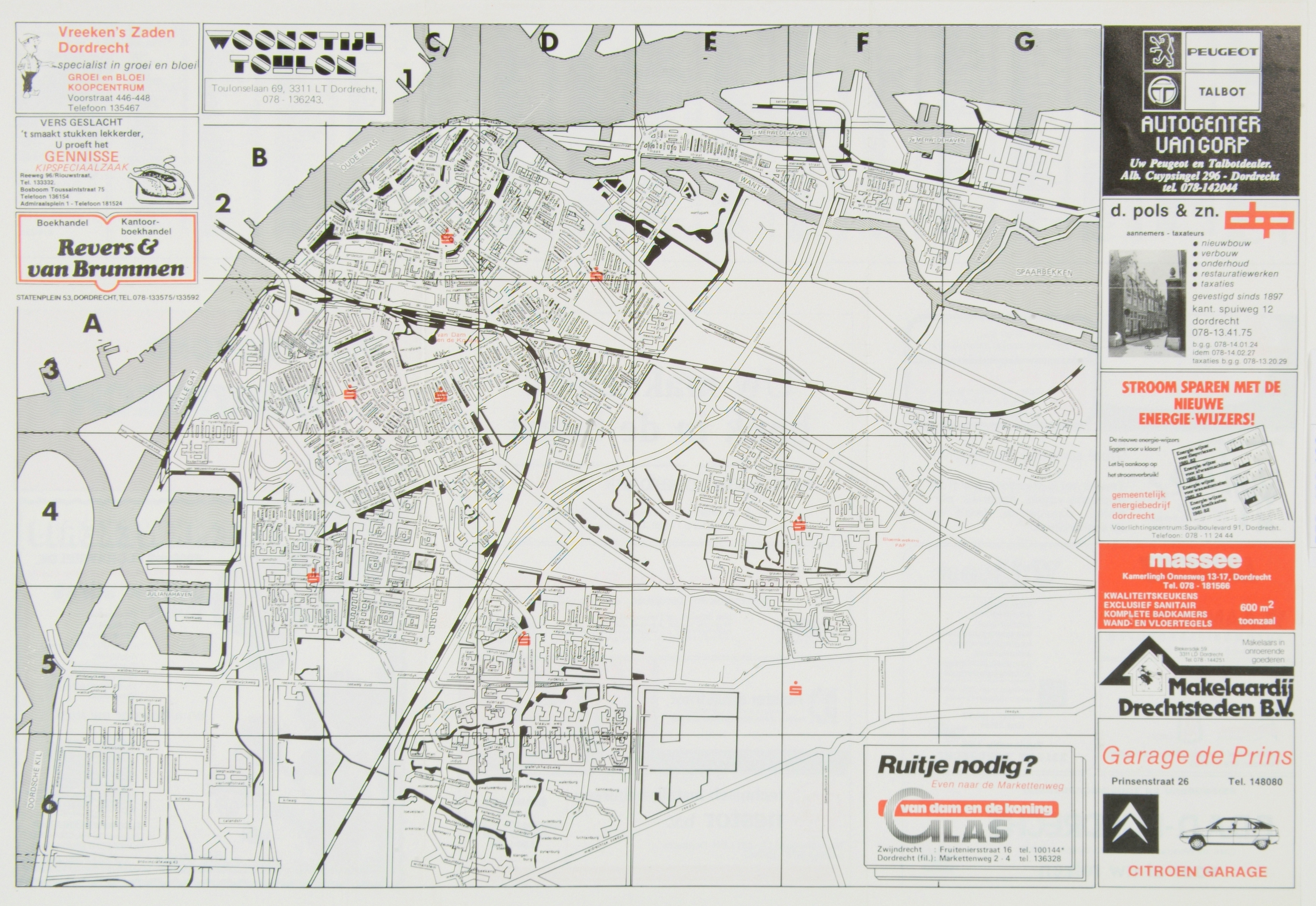 Plattegrond van Dordrecht met reclame en stratenregister.