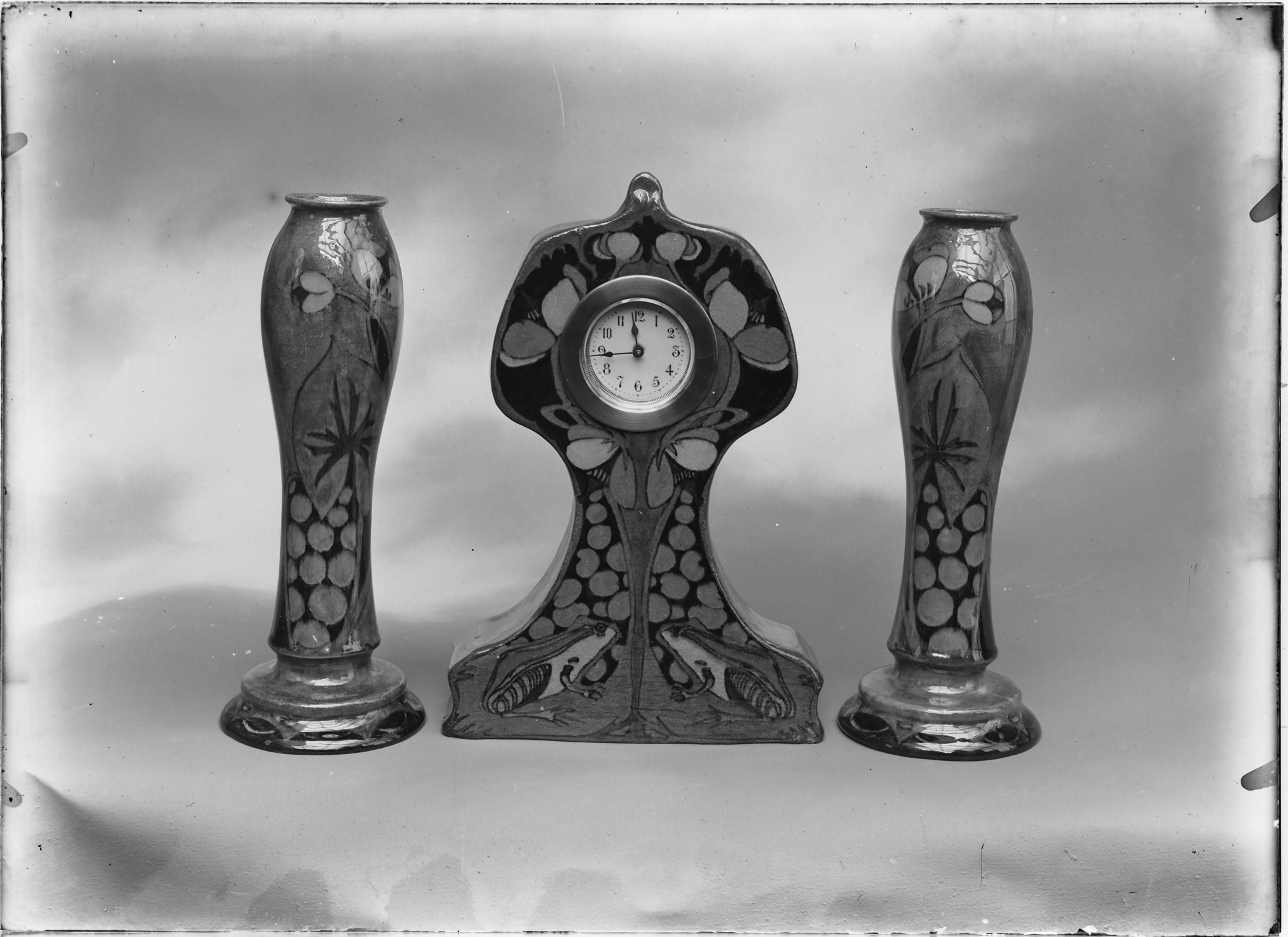 - Twee vazen en een klok vervaardigd door de Dordtsche Kunstpotterij aan de Blekersdijk