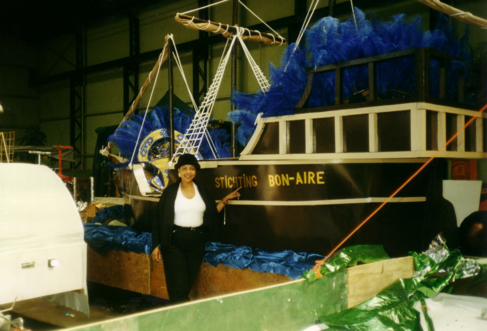 - Michi Everts bij praalwagen van carnavalsgroep Maskarada di Bonaire van Stichting Bon-Aire