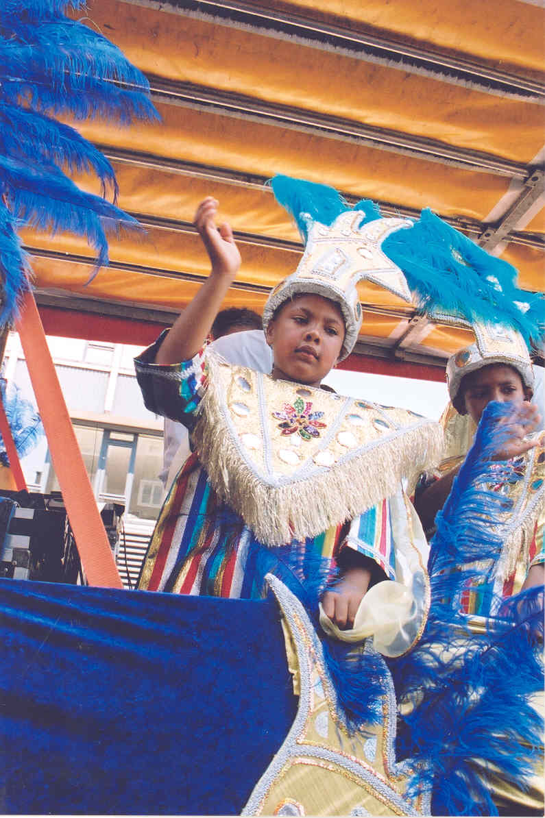 - Isa Everts (links) tijdens parade op praalwagen van carnavalsgroep Maskarada di Bonaire.