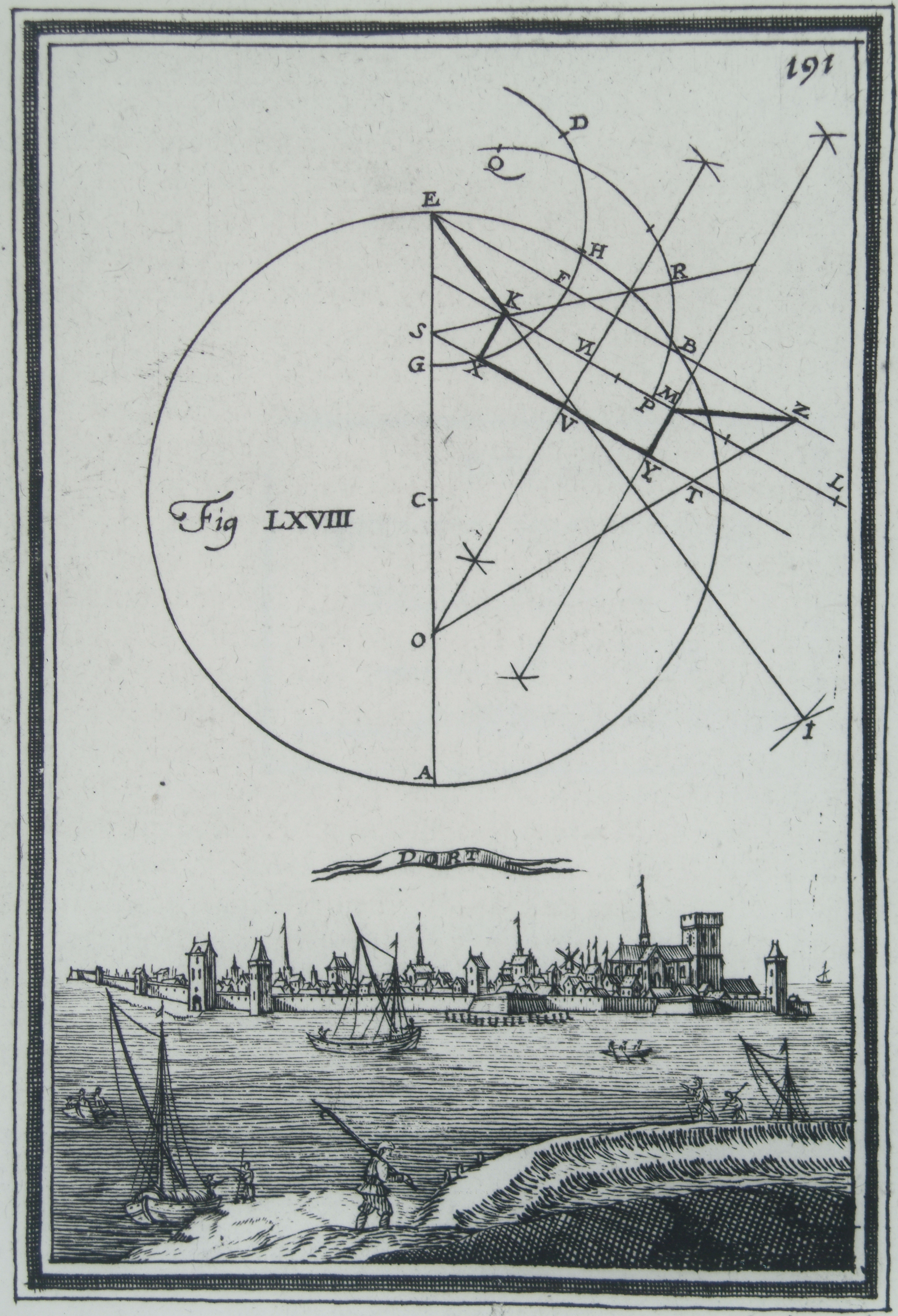 Gezicht op Dordrecht vanaf Zwijndrecht ca 1670 met meetkundige figuur betreffende de …