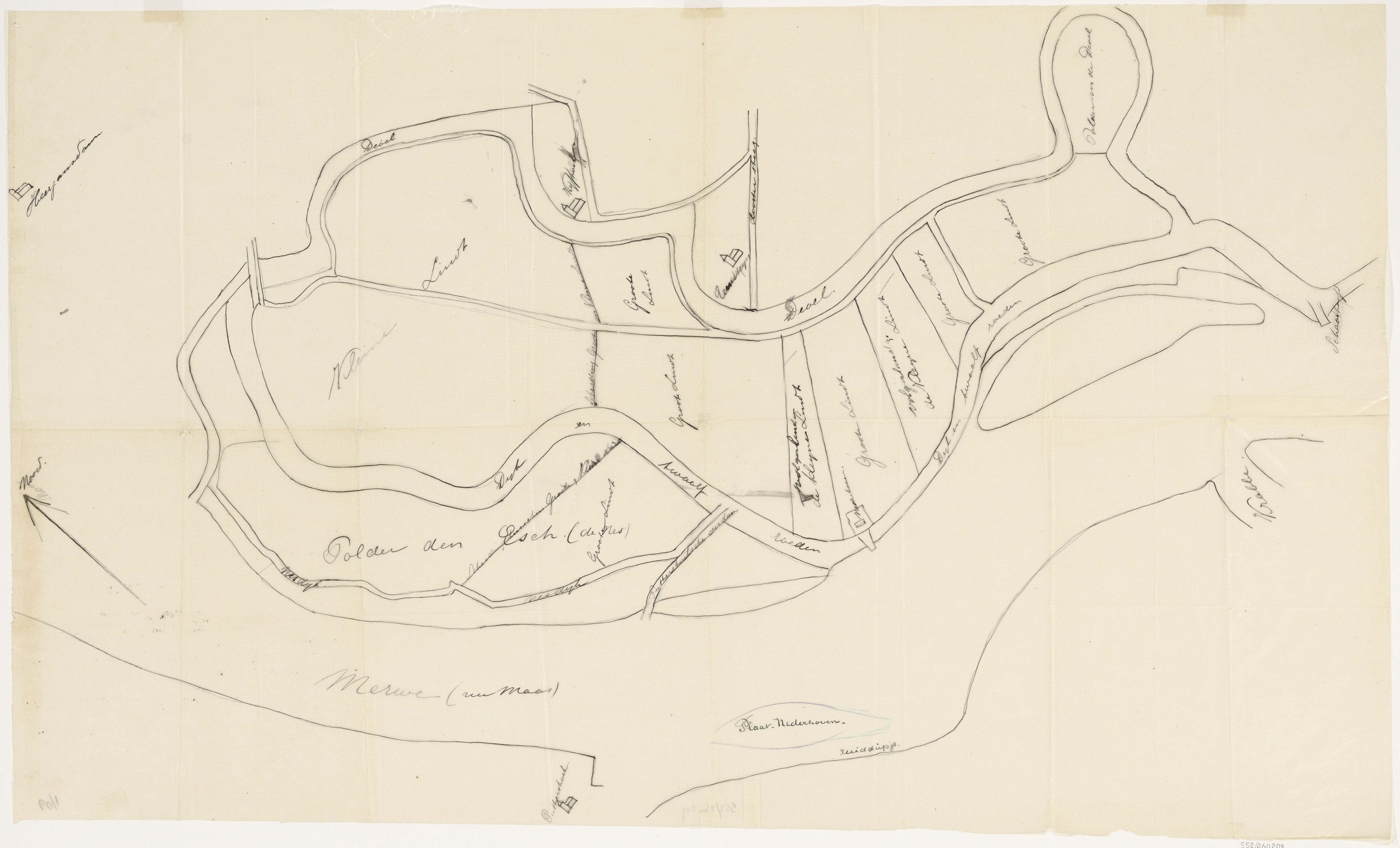 - Een kaart van de Oude Maas, betreffende de bocht bij de Krabbepolder tot Heerjansdam, met op de noordoever percelen m.b.t. het visrecht op zalm te Kleine Lindt.