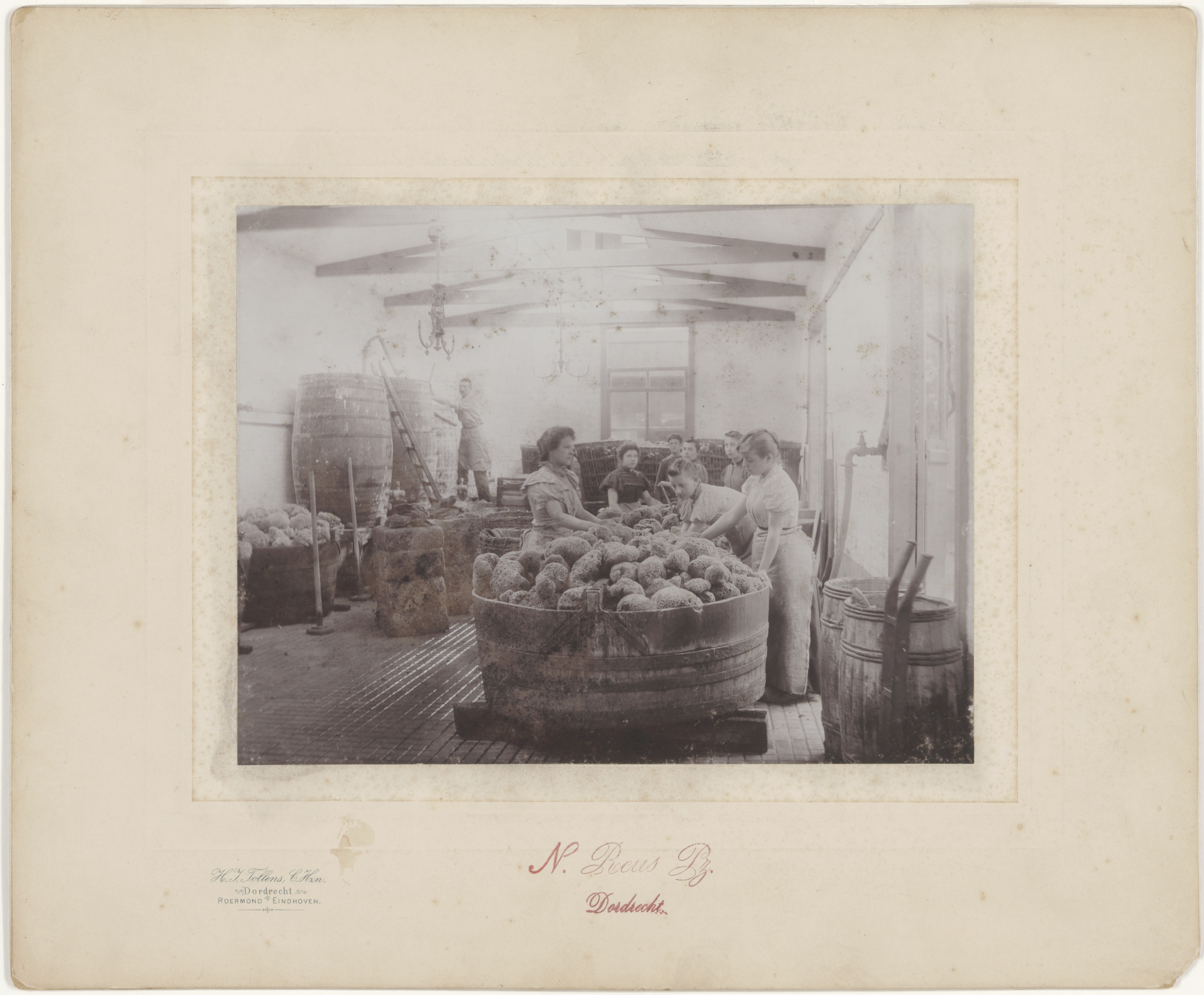 - Een werkruimte in het pand Groenmarkt 33 van de Sponsen- en Zeemleerhandel N. Reus Pzn. De wasserij van sponsen in doorgezaagde kuipen van brouwerij De Sleutel.