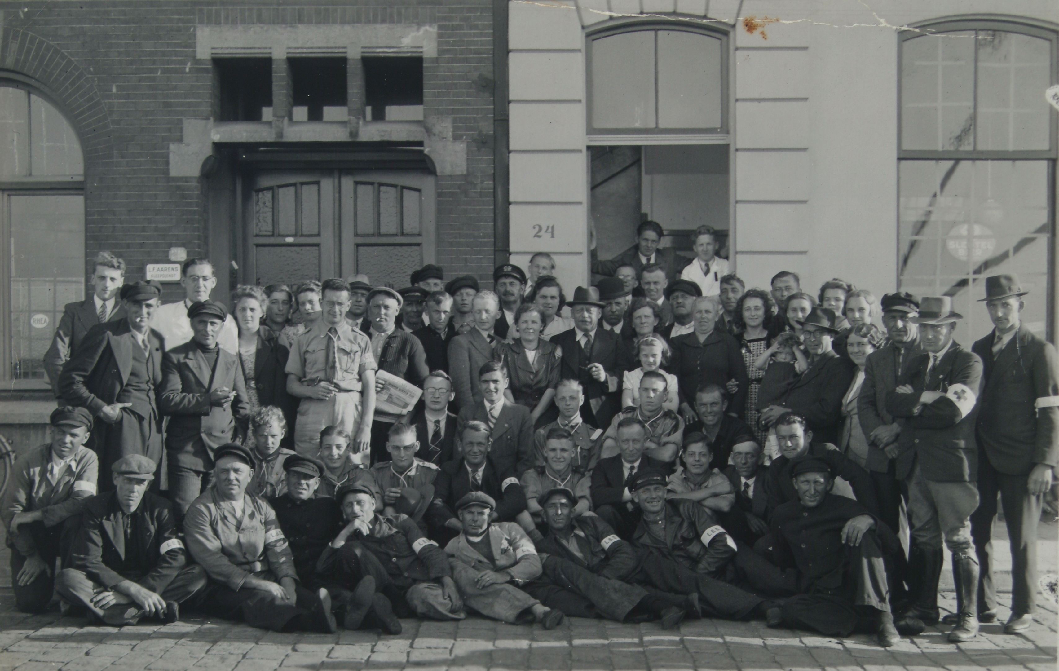 - Een groep medewerkers van het Rode Kruis afdeling Dordrecht en leden van de luchtbeschermingsdienst voor hulp aan buitenlandse passerende krijgsgevangenen bij een pand op de Merwekade. Linksboven A. de Jong en W.J. Booij, uiterst rechts dhr. Touwslager.