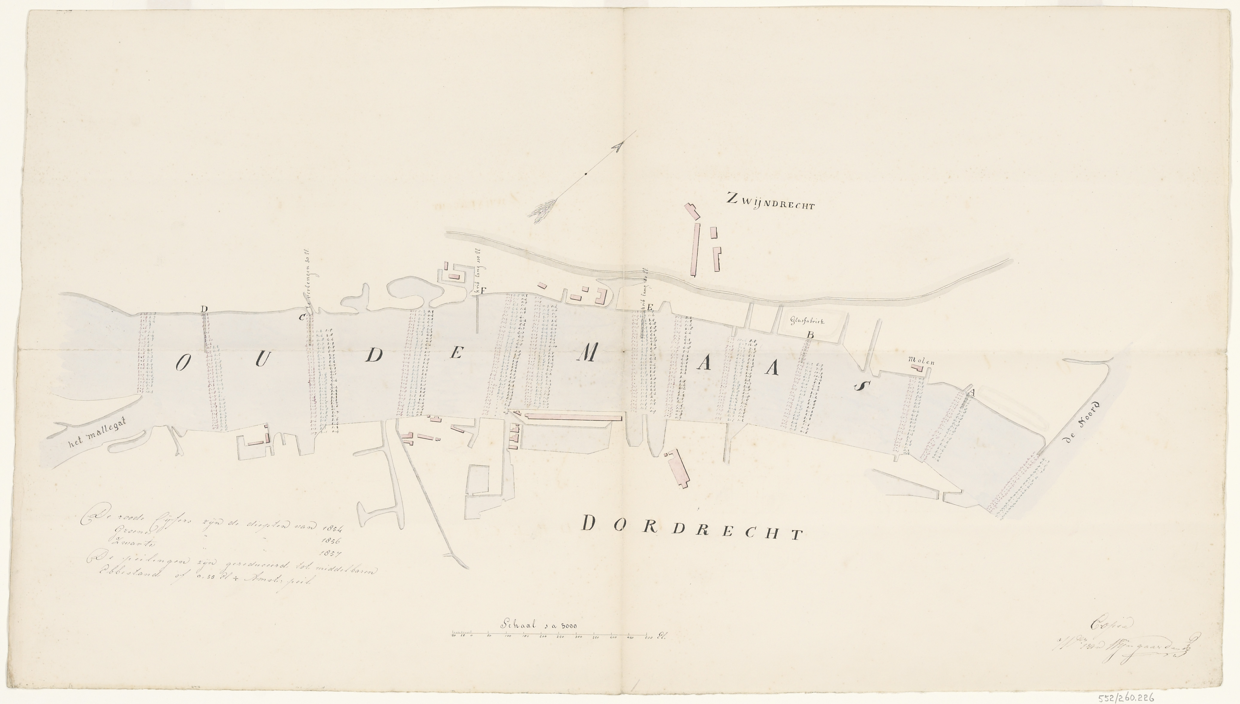 - Een rivierkaart van de Oude Maas, lopende van het Mallegat tot de Noord, met daarop aangegeven de dieptepeilingen van 1854, 1856 en 1857.