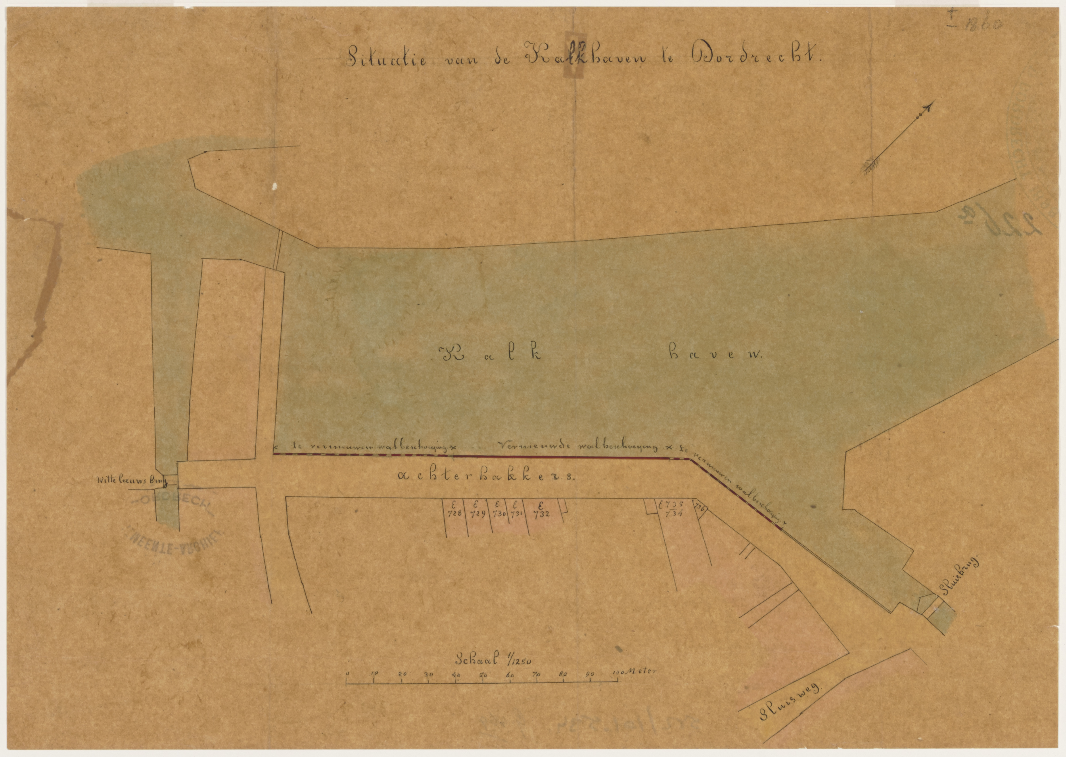 - Kaart van de Kalkhaven en het Achterhakkers. Met nadruk op de "vernieuwde en te vernieuwen walbeschoeiing" aan de zuidzijde van de Kalkhaven. Kompaspijl rechtsboven. Noordwesten boven. Schaalstok: 100 meter = 8 cm. Schaal 1:1250.