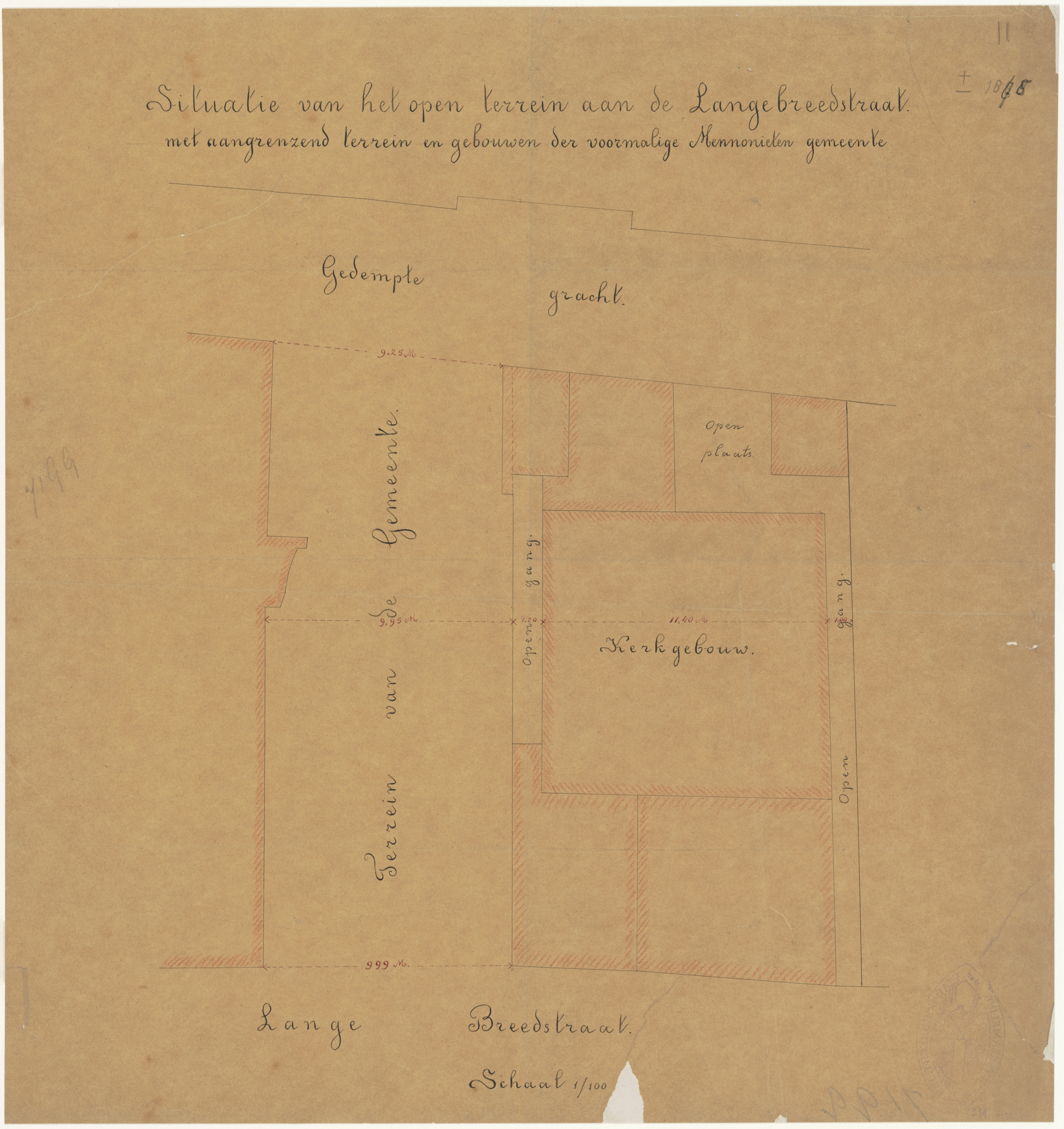 - Kaart van het open terrein aan de Lange Bree(d)straat, met aangrenzend terrein en gebouwen van de voormalige Mennonieten-gemeente. Zuidoosten boven. Schaal 1:100.