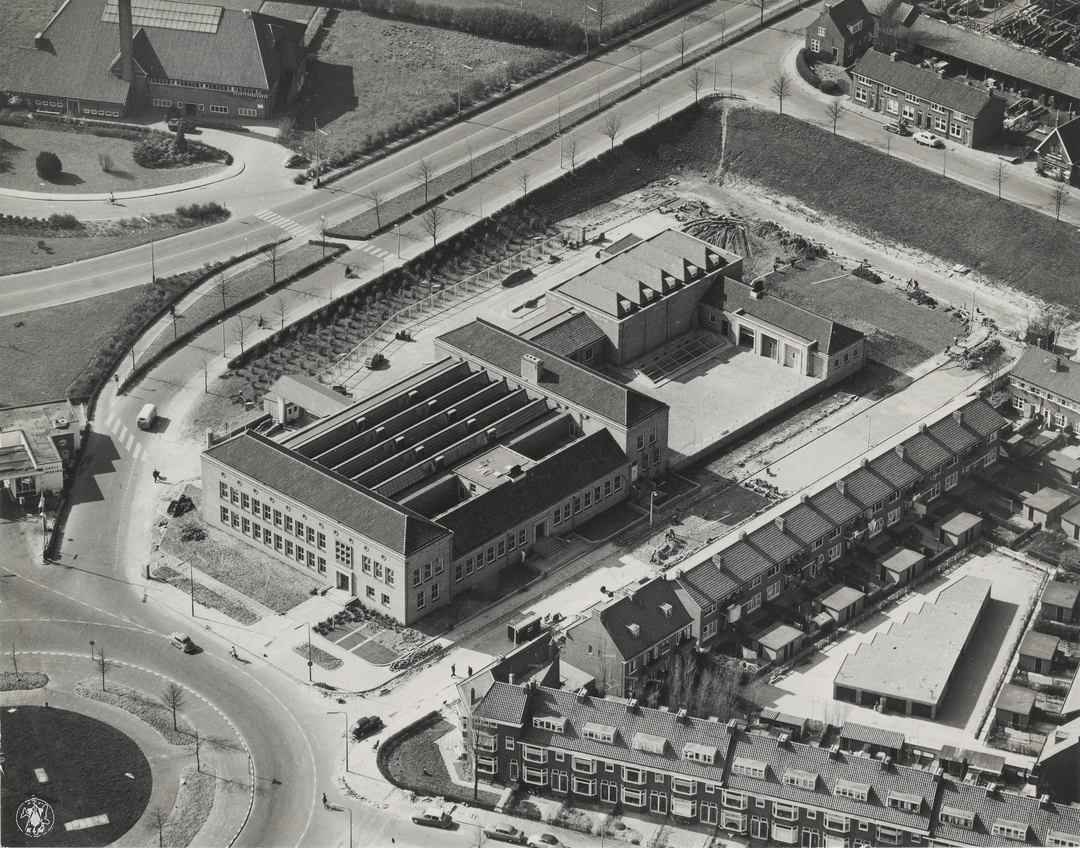 Luchtfoto van het IJkkantoor aan het Hugo de Grootplein. Linksboven het …