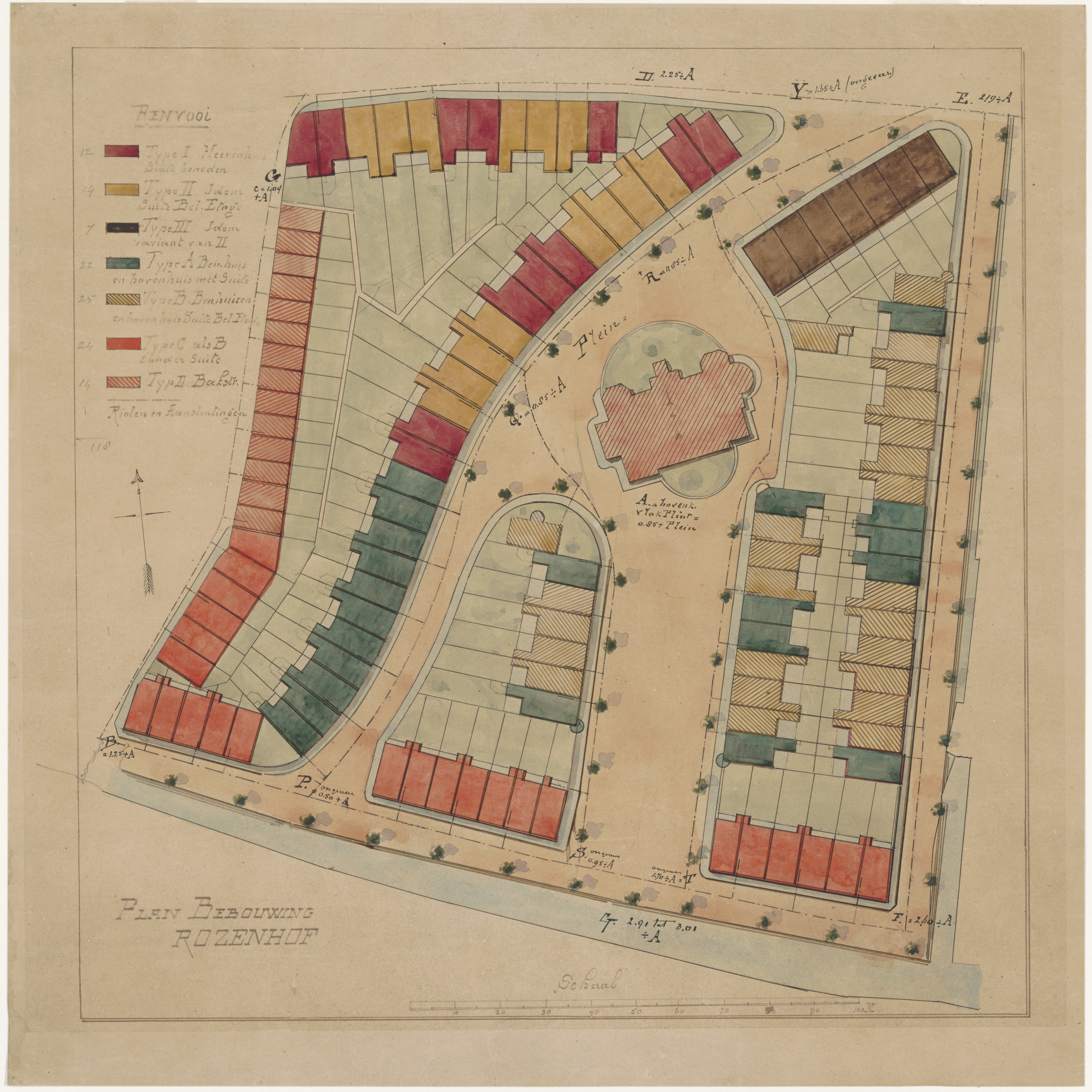 - (Niet uitgevoerd) Bebouwingsplan voor het terrein rondom de "Rozenhof", omzoomd door Spoorsingel (=Havenstraat), Rozenhoflaan (= Koninginnestraat), (Van Strij)Singel en (Hoge) Bakstraat. Met aanduiding van de verschillende woningtypen.