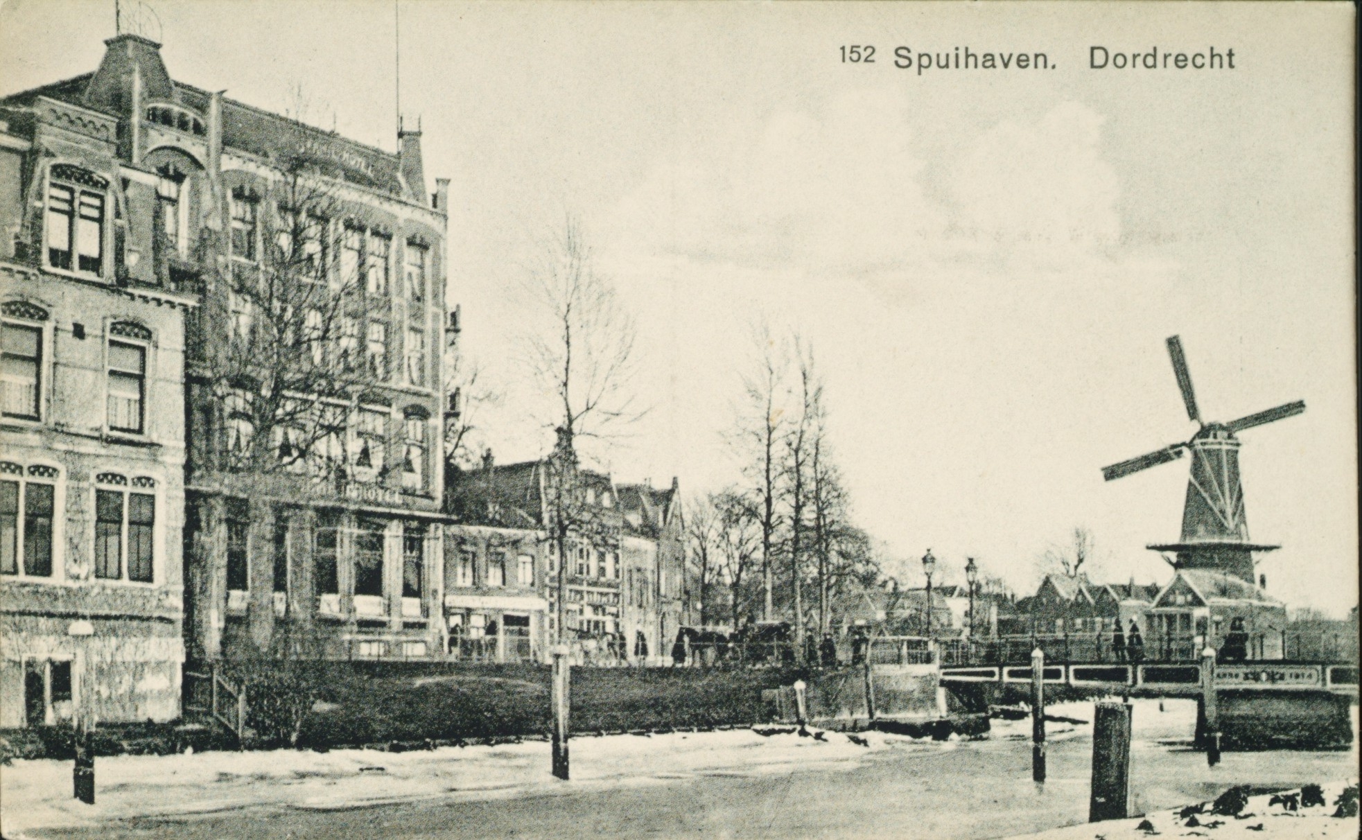 - Rechts molen "De Maagd"aan de Cornelis de Wittstraat. Recht in het midden de Johan de Wittbrug en links het Oranjehotel.