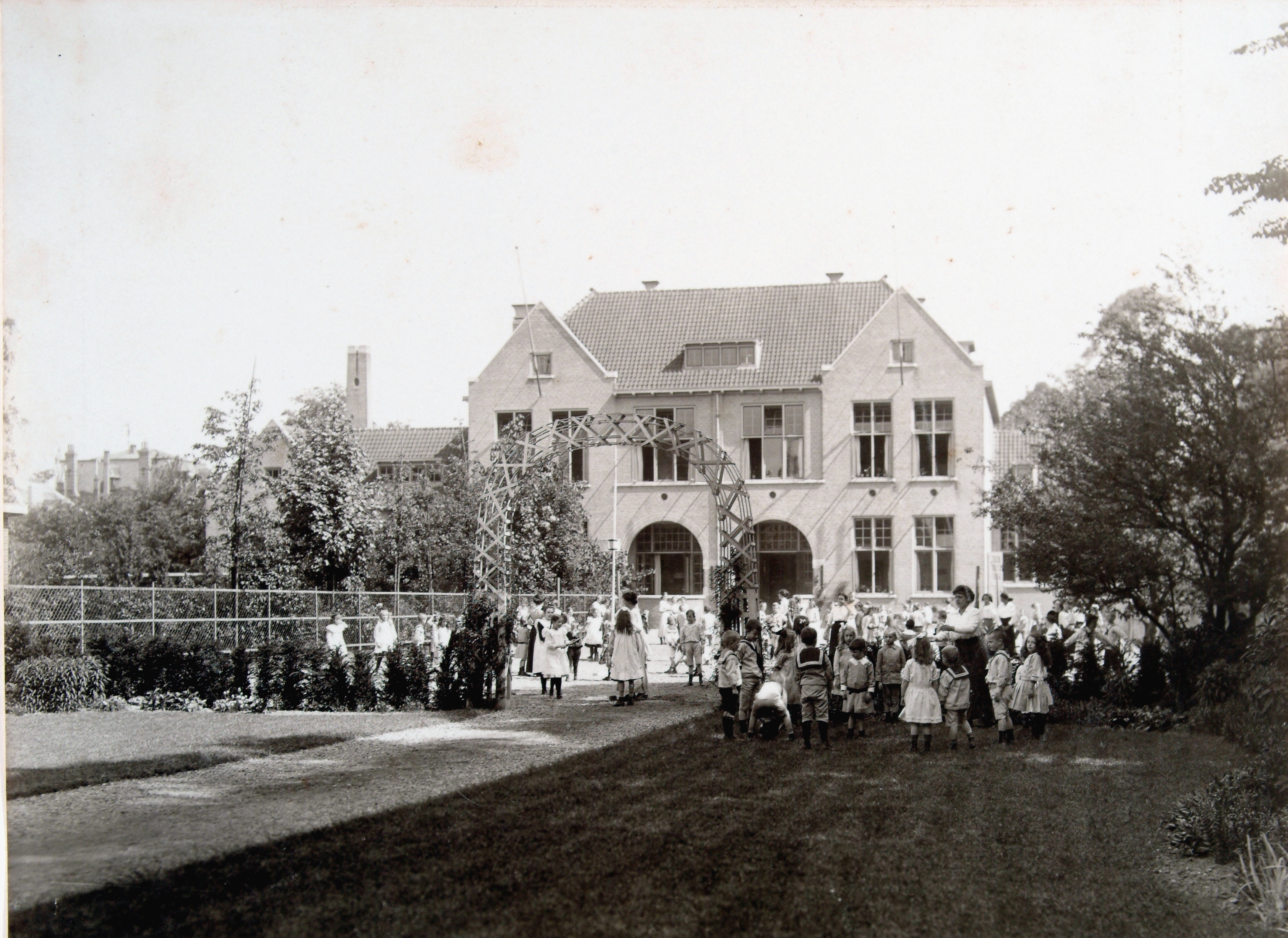 - School Mühring met leerlingen in de tuin aan de Vrieseweg.