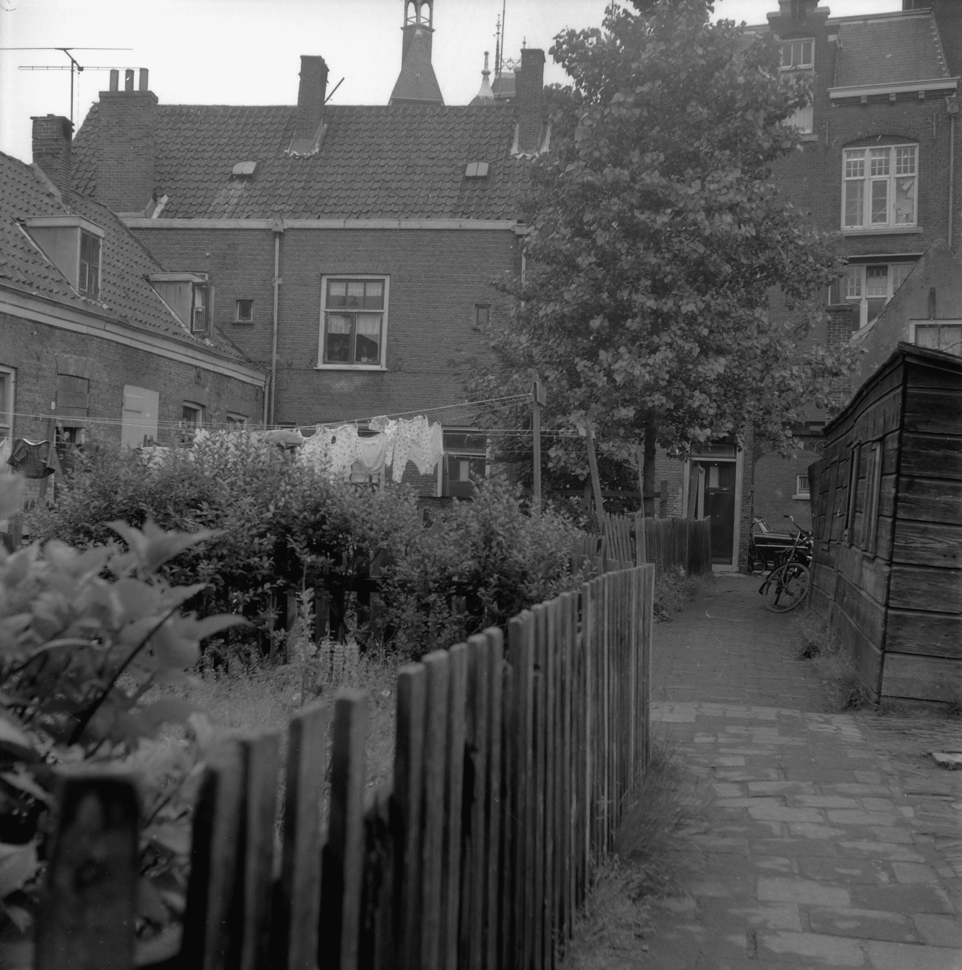 Deze hof is aan het Achterom, ik denk dat het Hof Welgelegen is (Achterom nr.2). Op de achtergrond links boven de huizen de toppen van de torens van het oude postkantoor aan het Bagijnhof. Dezelfde torens zie je op 556_1291. Recht vooruit kijk je door de poort naar de achterkant van het postkantoor, getekend op 551_20114. De kopse kant (hoger huis) van het hofje links zie je ook op de panoramafoto 554_32736, rechts van het midden.