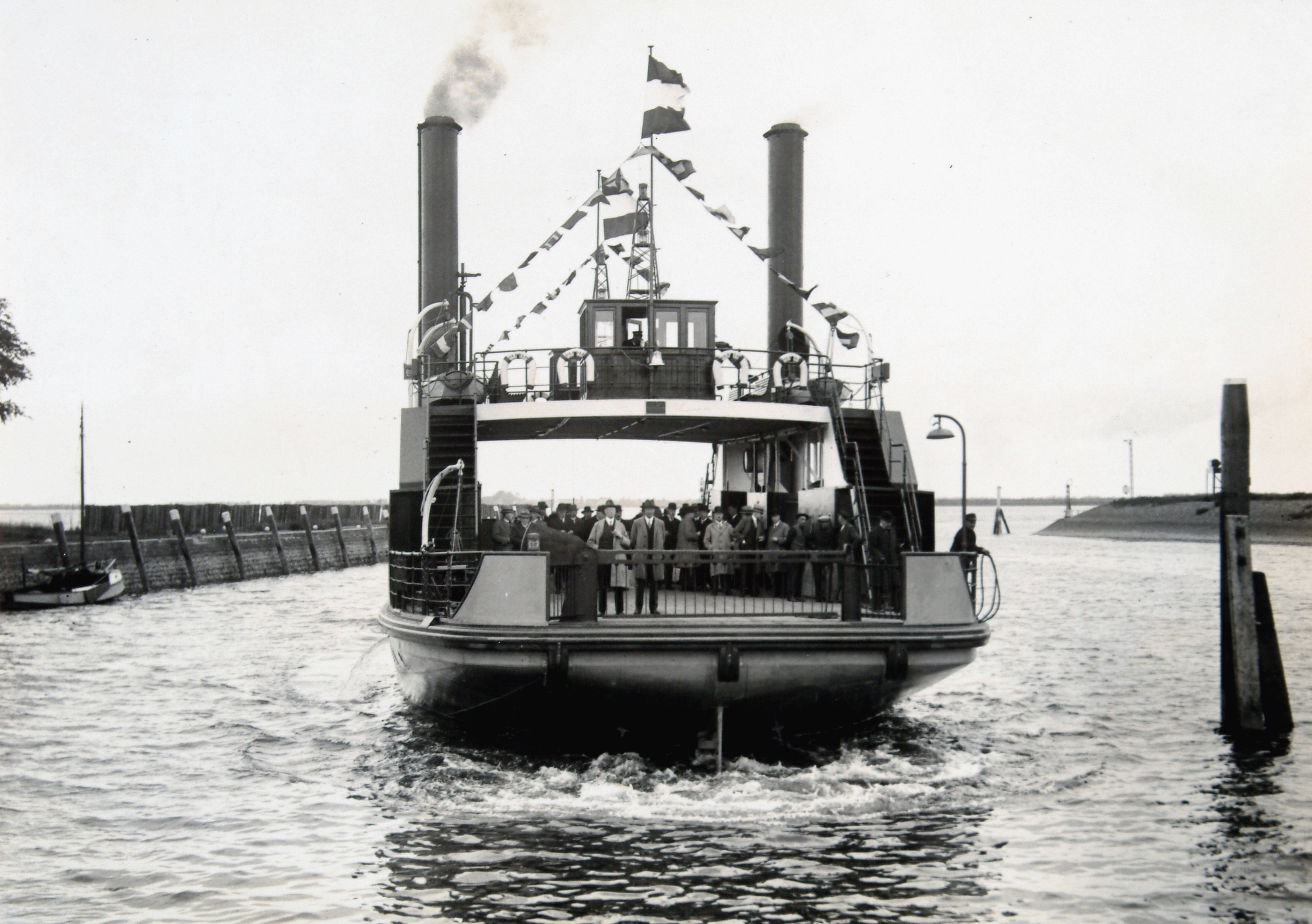- Genodigden bij de opening van de nieuwe veerdienst op de pont in de haven van Moerdijk.